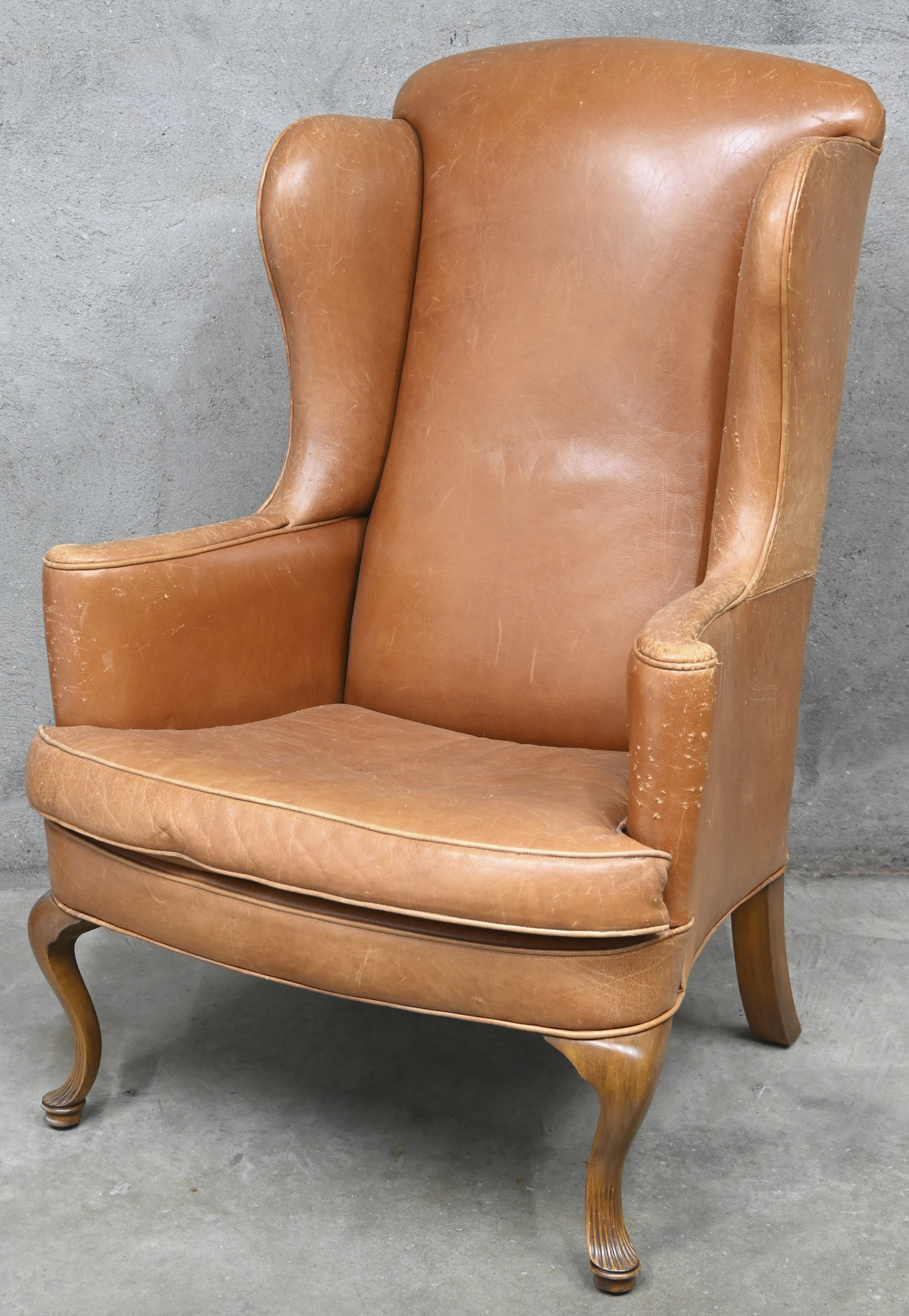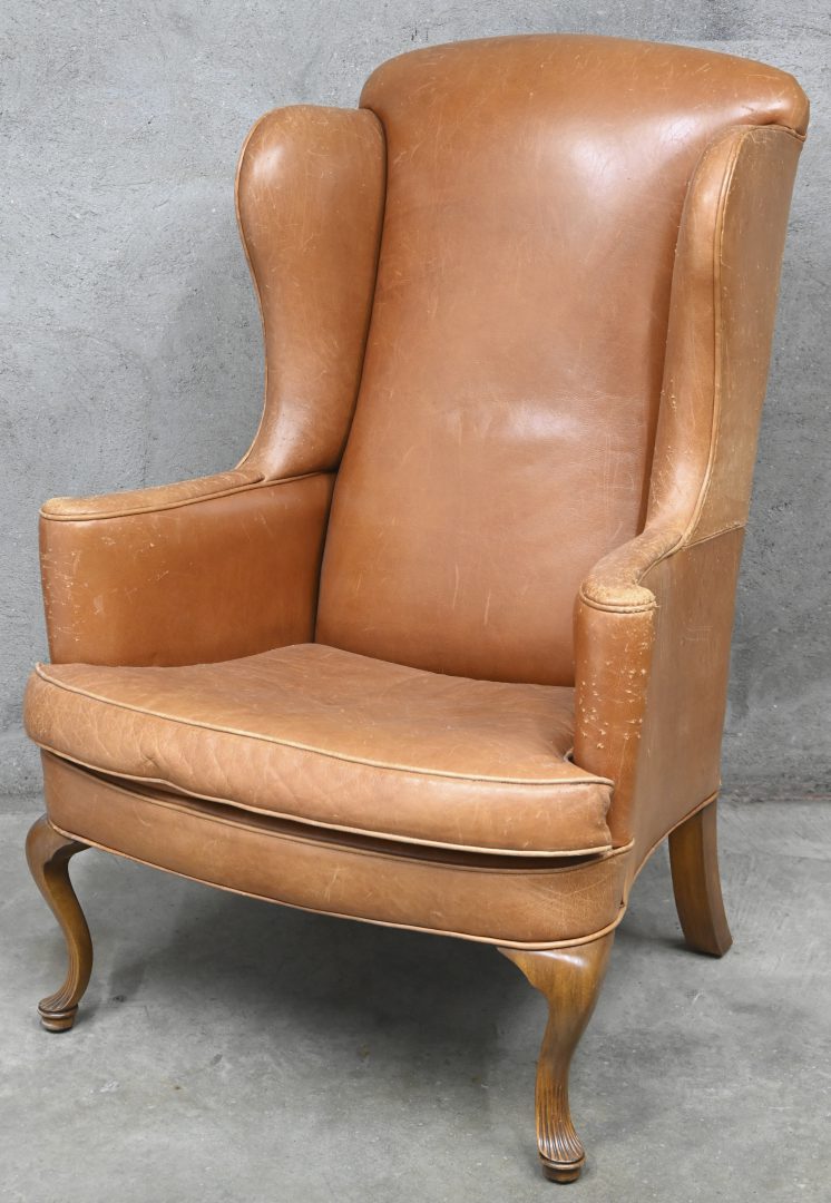 Een lederen armstoel, Queen Anne -stijl, slijtage aan de armleuningen.