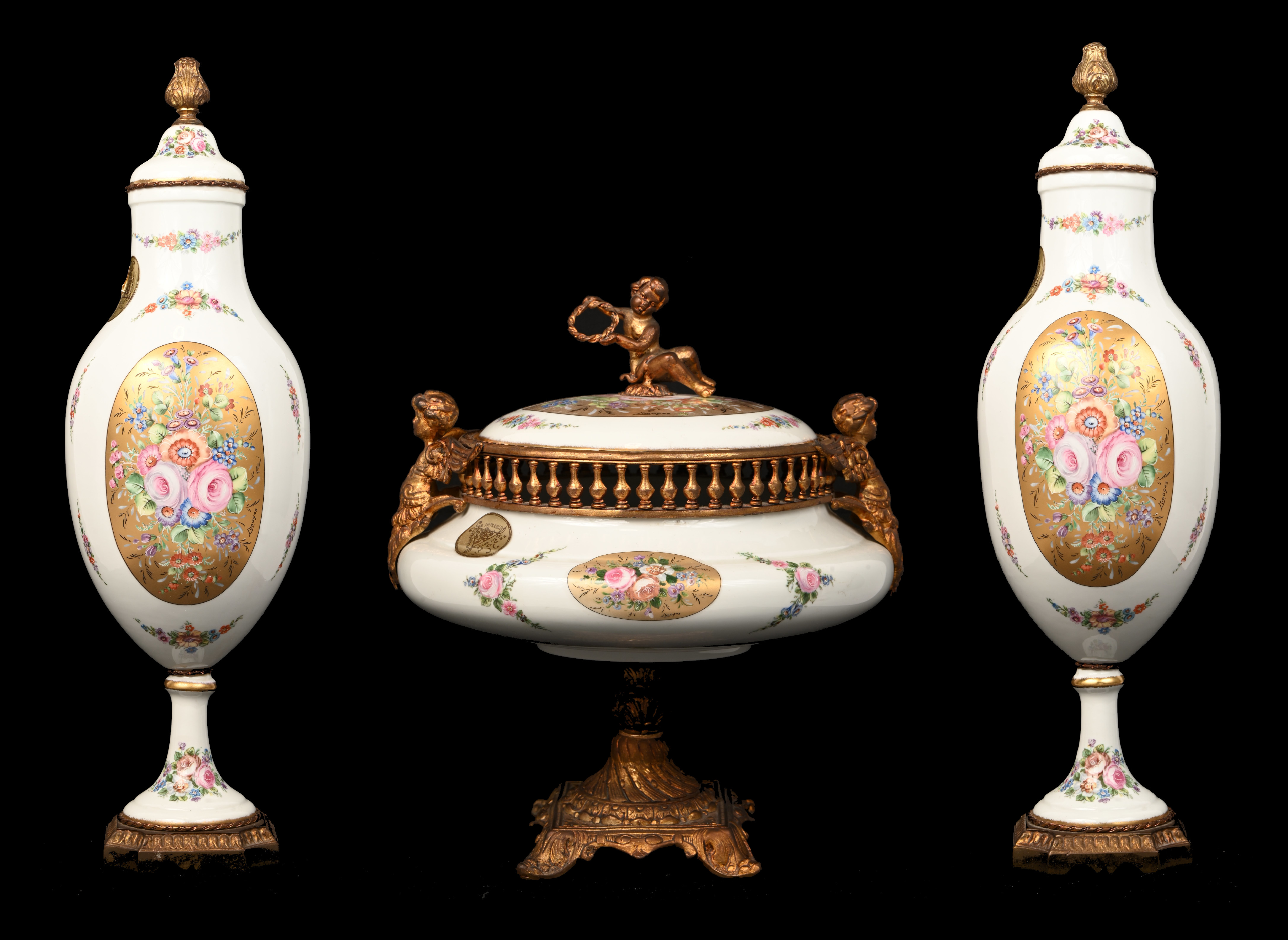 #41Een bronzen mantelklok in Rococo stijl met twee bijpassende kandelaars. Het binnenwerk van de klok is manco.