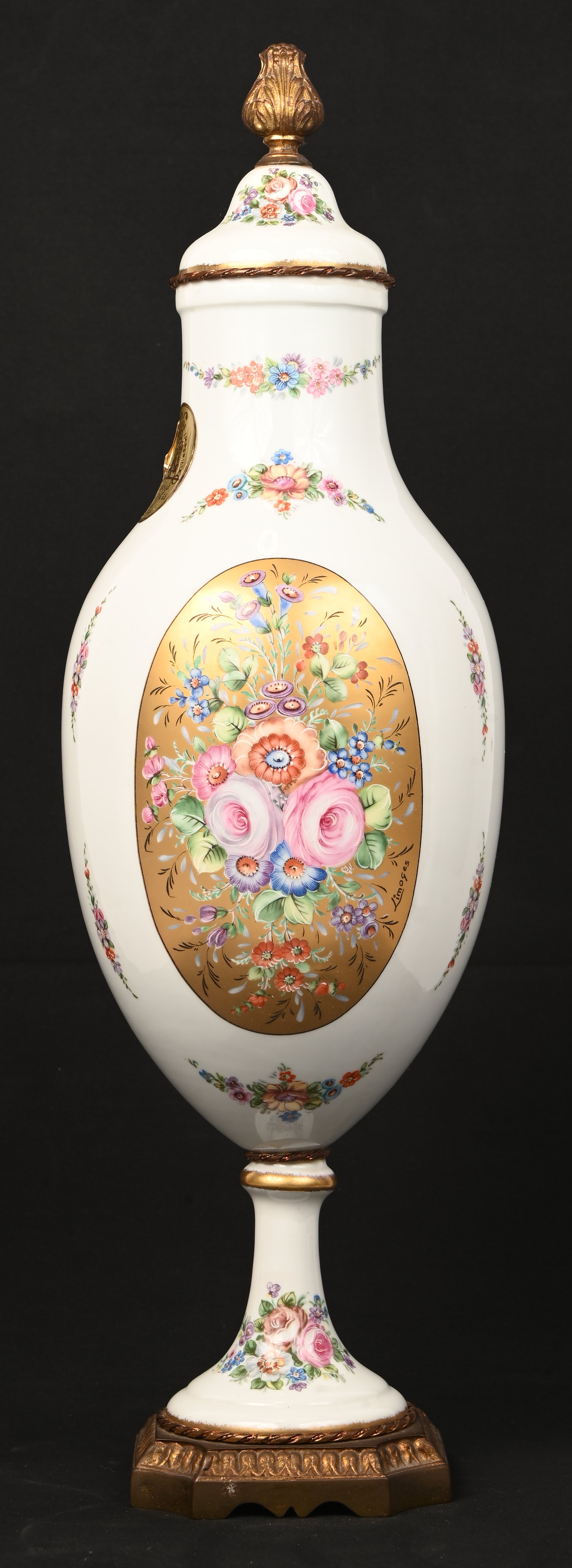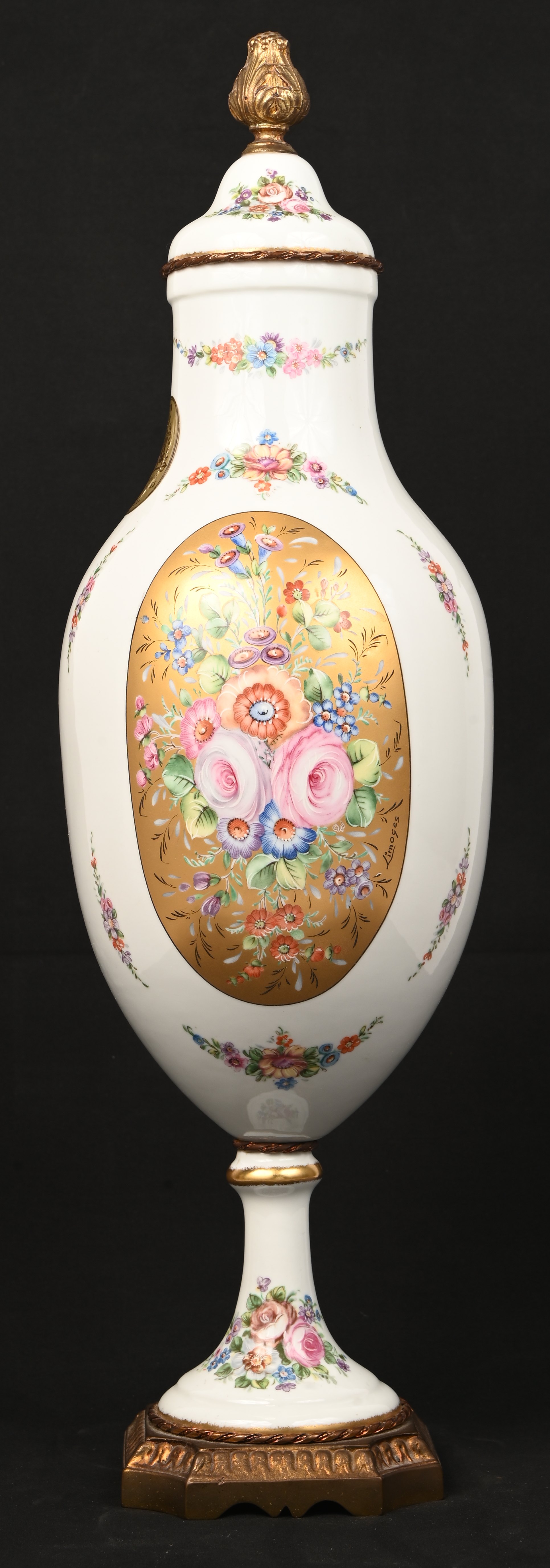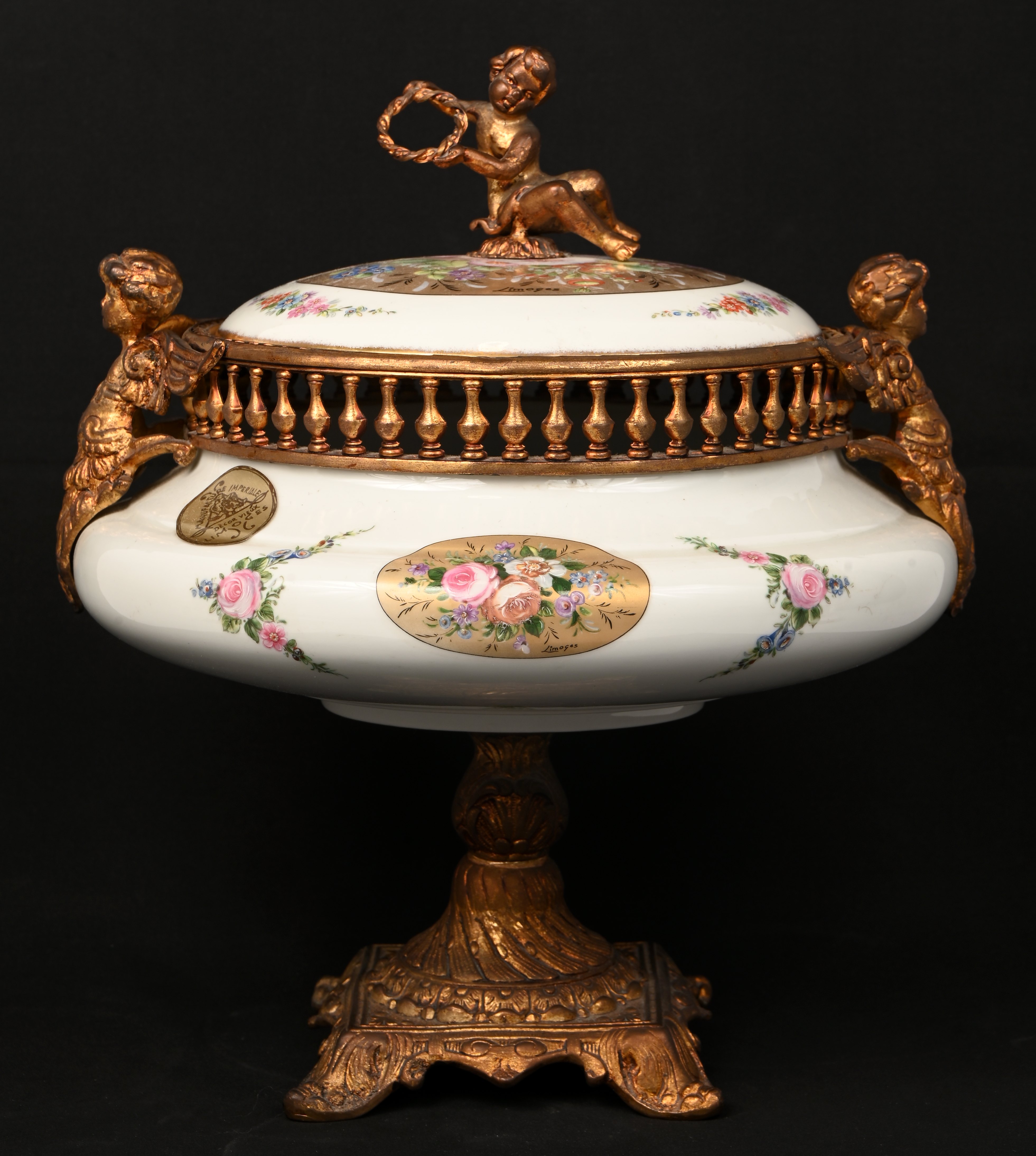 An art-deco coupe on a pedestal, made of metal and marble. The lid is missing. -
