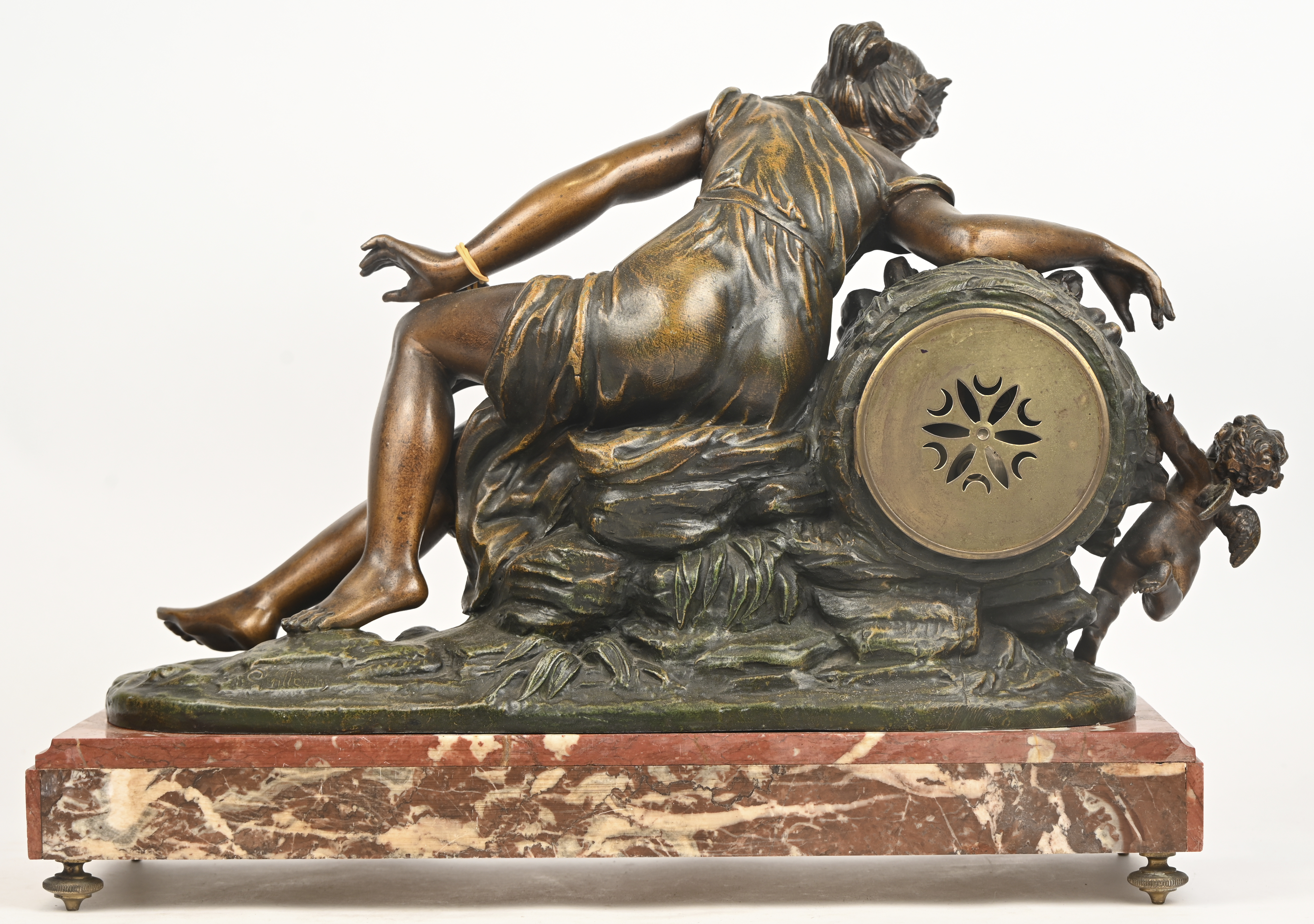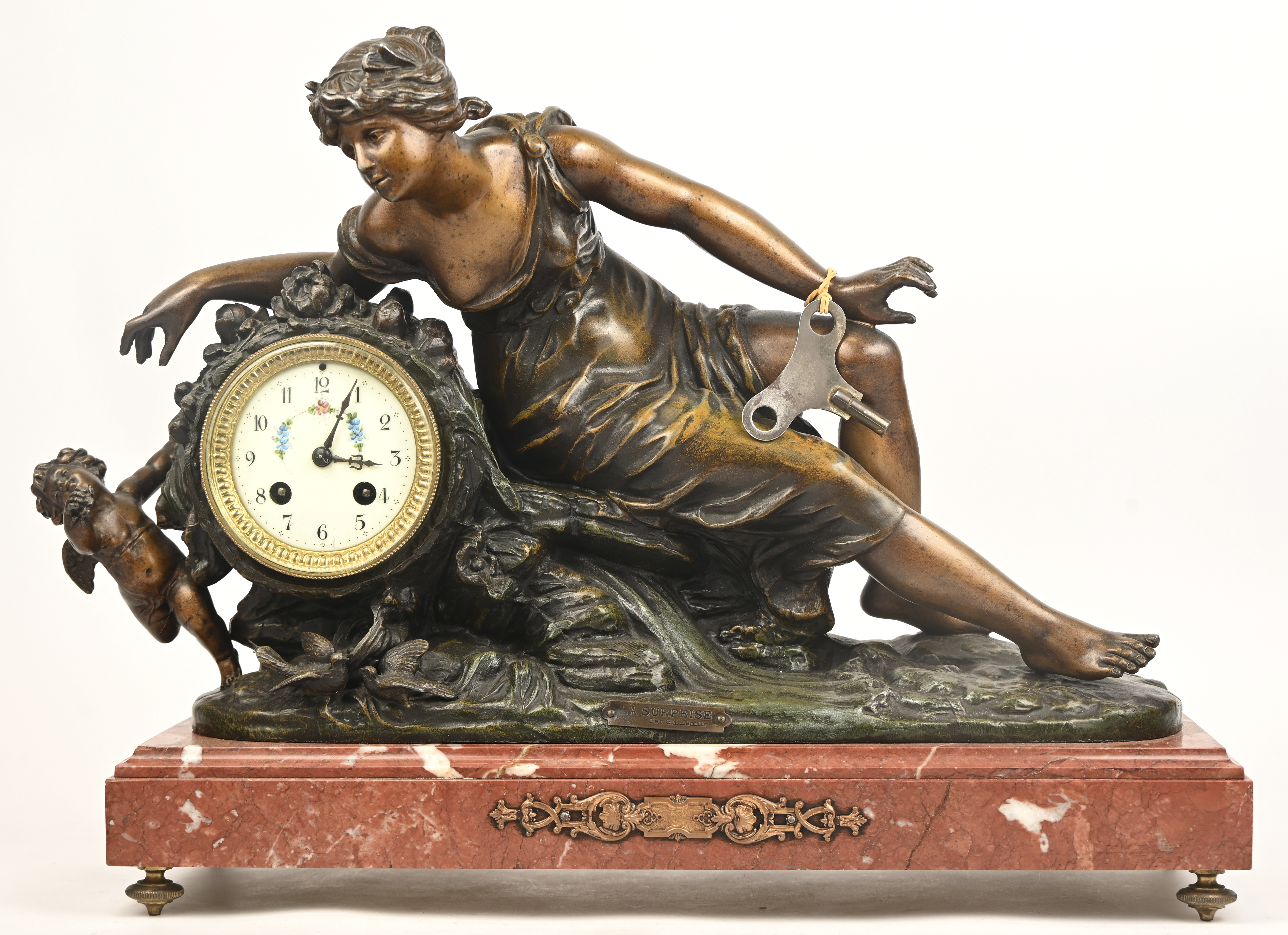 A Louis XVI clock with a gilt zamak figure ‘La Surprise’, after a work by Guillemin, on a marble base.