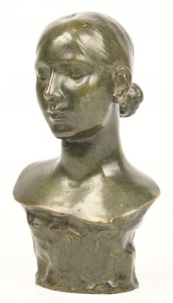 #51‘Buste van een jonge vrouw’, een beeldje van gepatinneerd brons. Getekend Straber.
