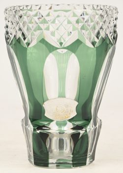 #302Val Saint LambertEen geslepen kristallen vaas, groen in de massa gekleurd, met sticker gemerkt.