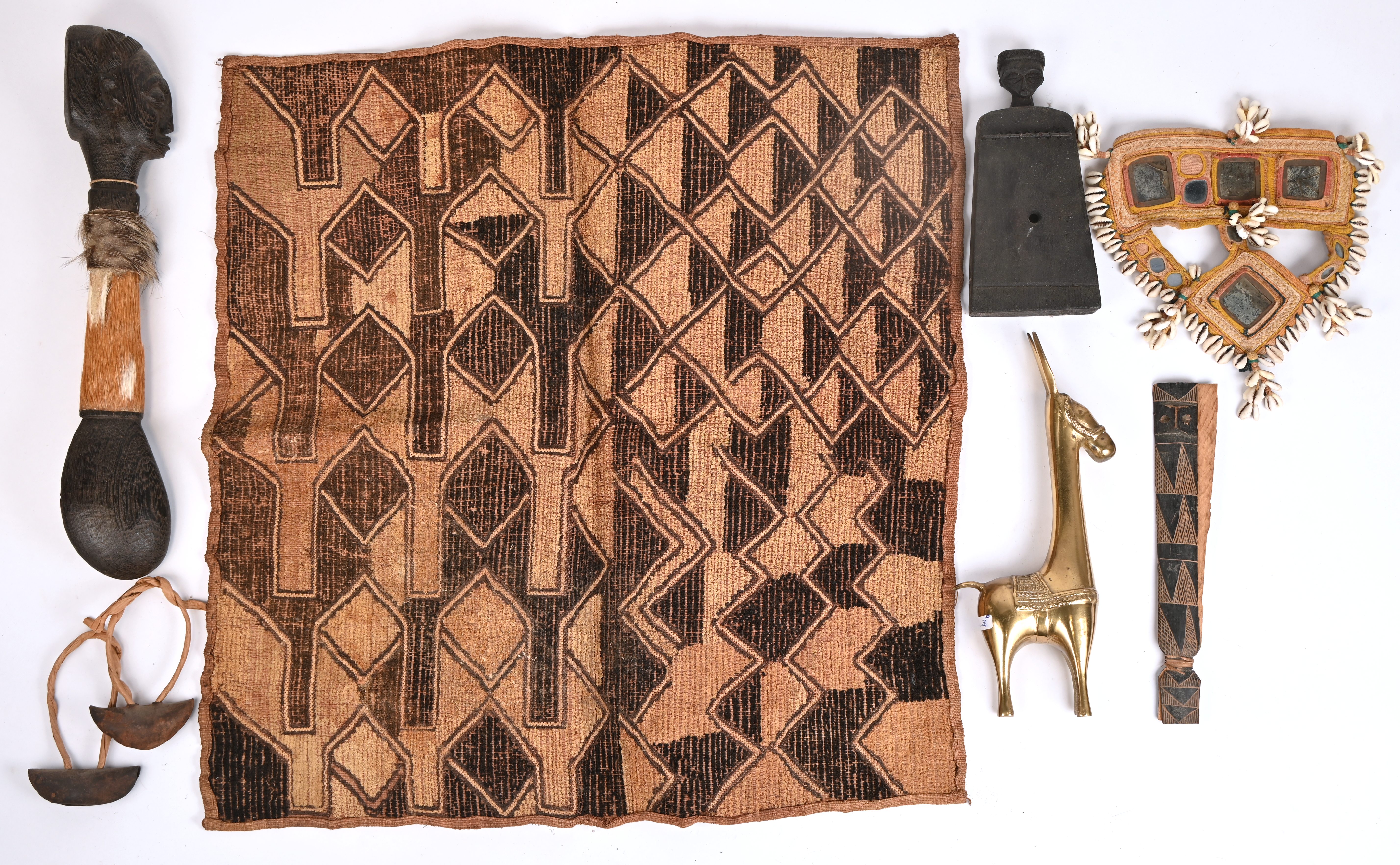 Een lot bestaande uit houten muziekinstrumenten, een staf van een opperhoofd uit Borswana (l. 42 cm), Textiel, een messingen ezel, bellen. enz.
