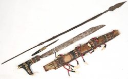 #29Een lot van 2 Afrikaanse wapens bestaande uit een kort zwaard en een kleine speer.
