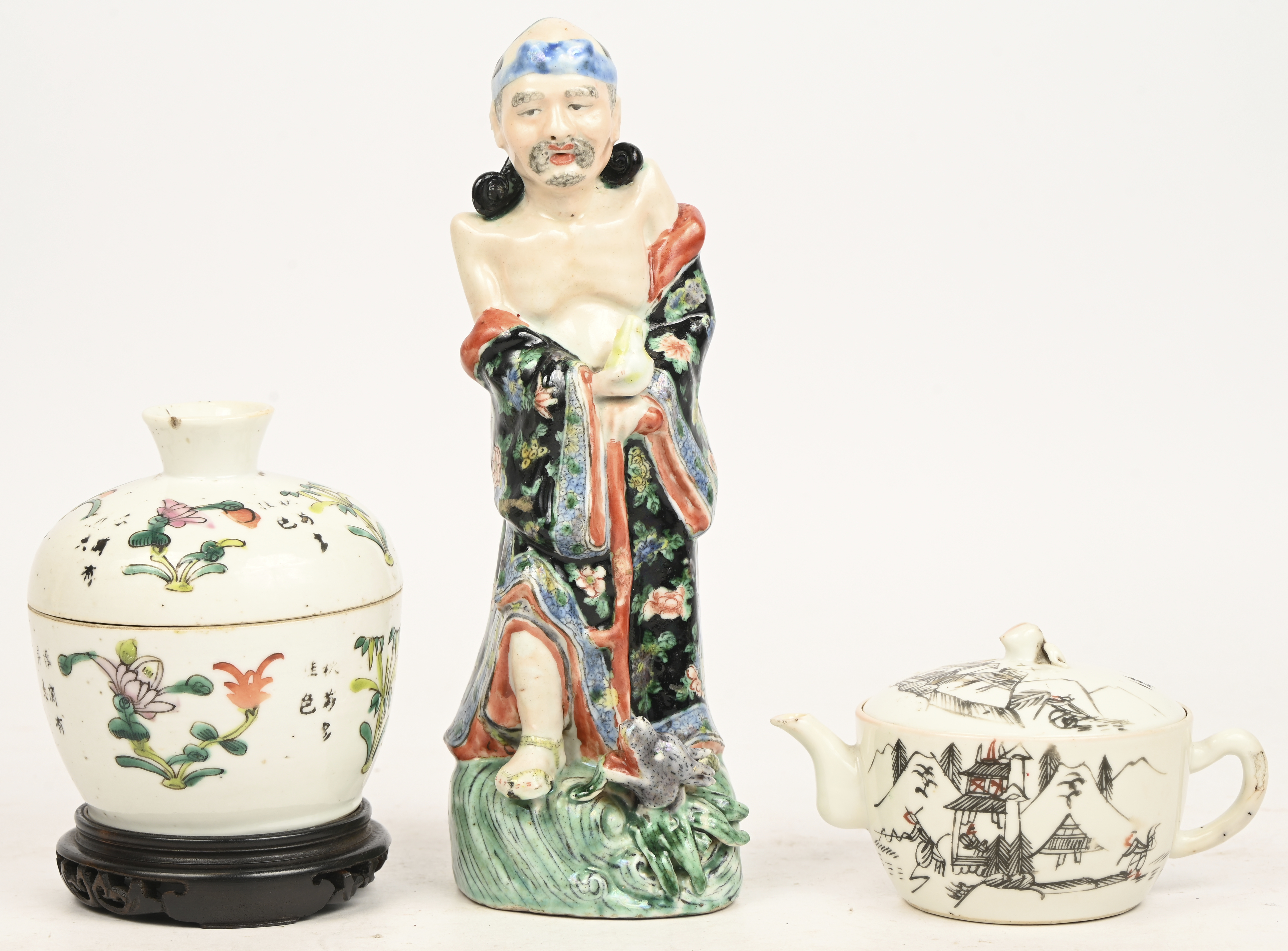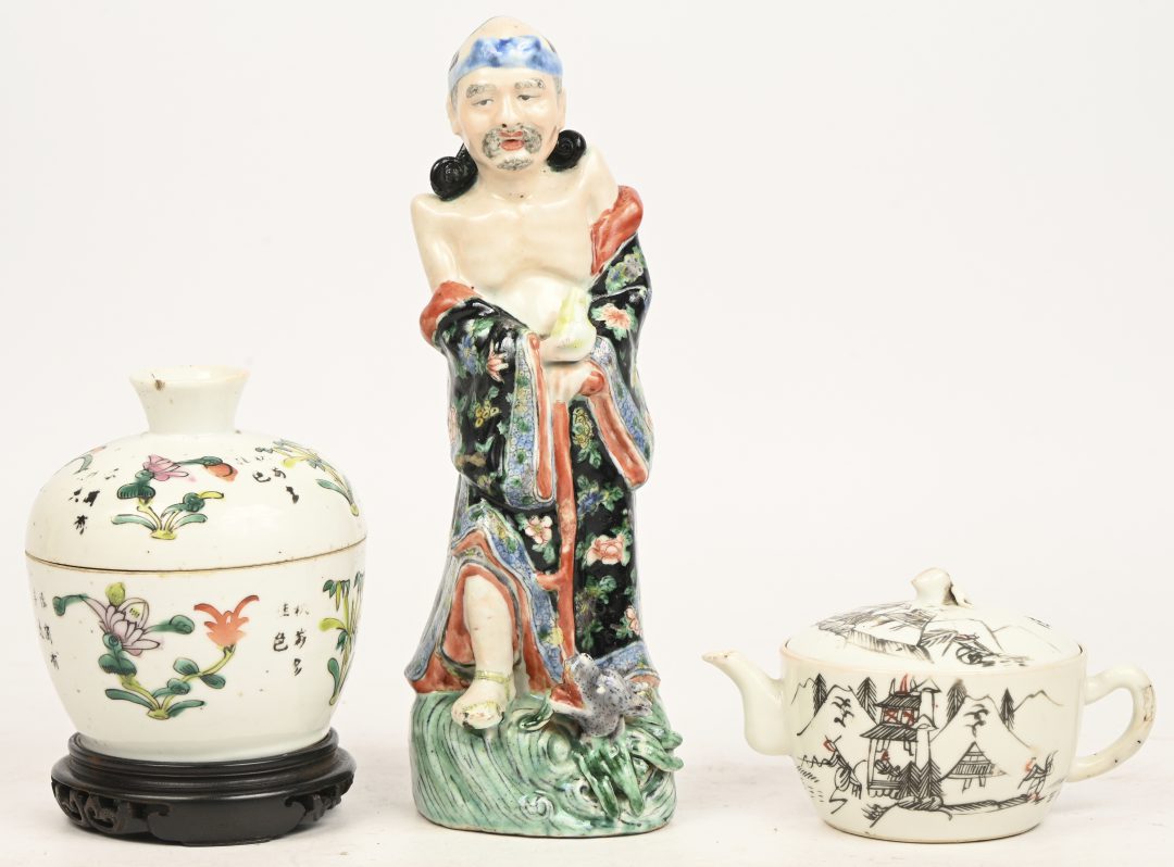 #120Een lot van Chinees porselein: drie dekselvazen, een kraagvaas famille verte en een kandelaar met western wapenschild.