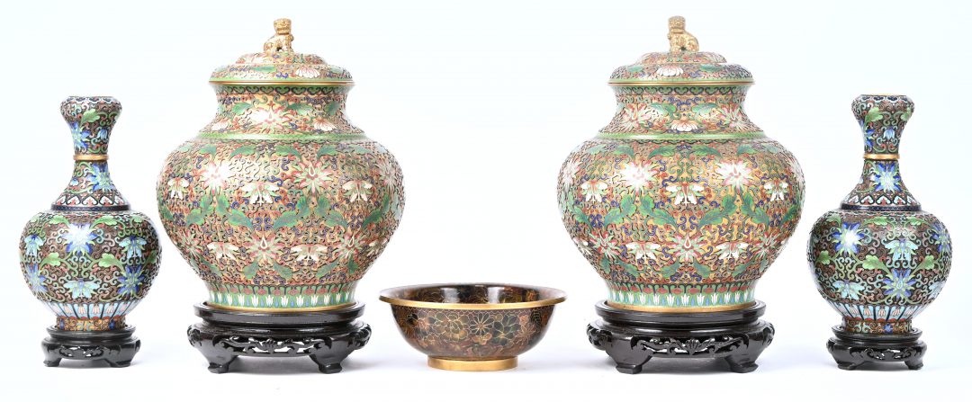 Een lot cloisonné bestaande uit 2 dekselvazen en 2 vaasjes, op houten sokkels, en een kom.