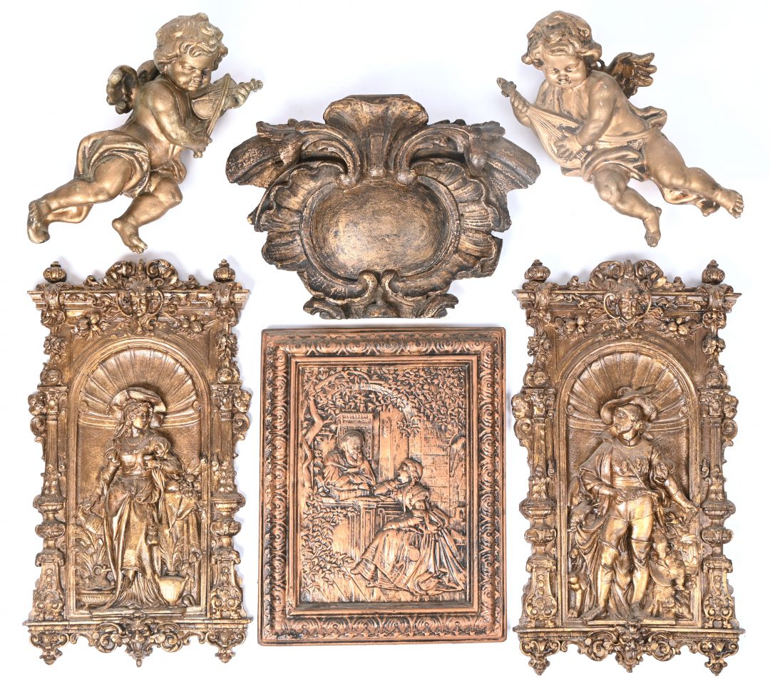 A lot of composite material consisting of 3 bas-reliefs and 2 angels. Added: a wooden decorative piece.