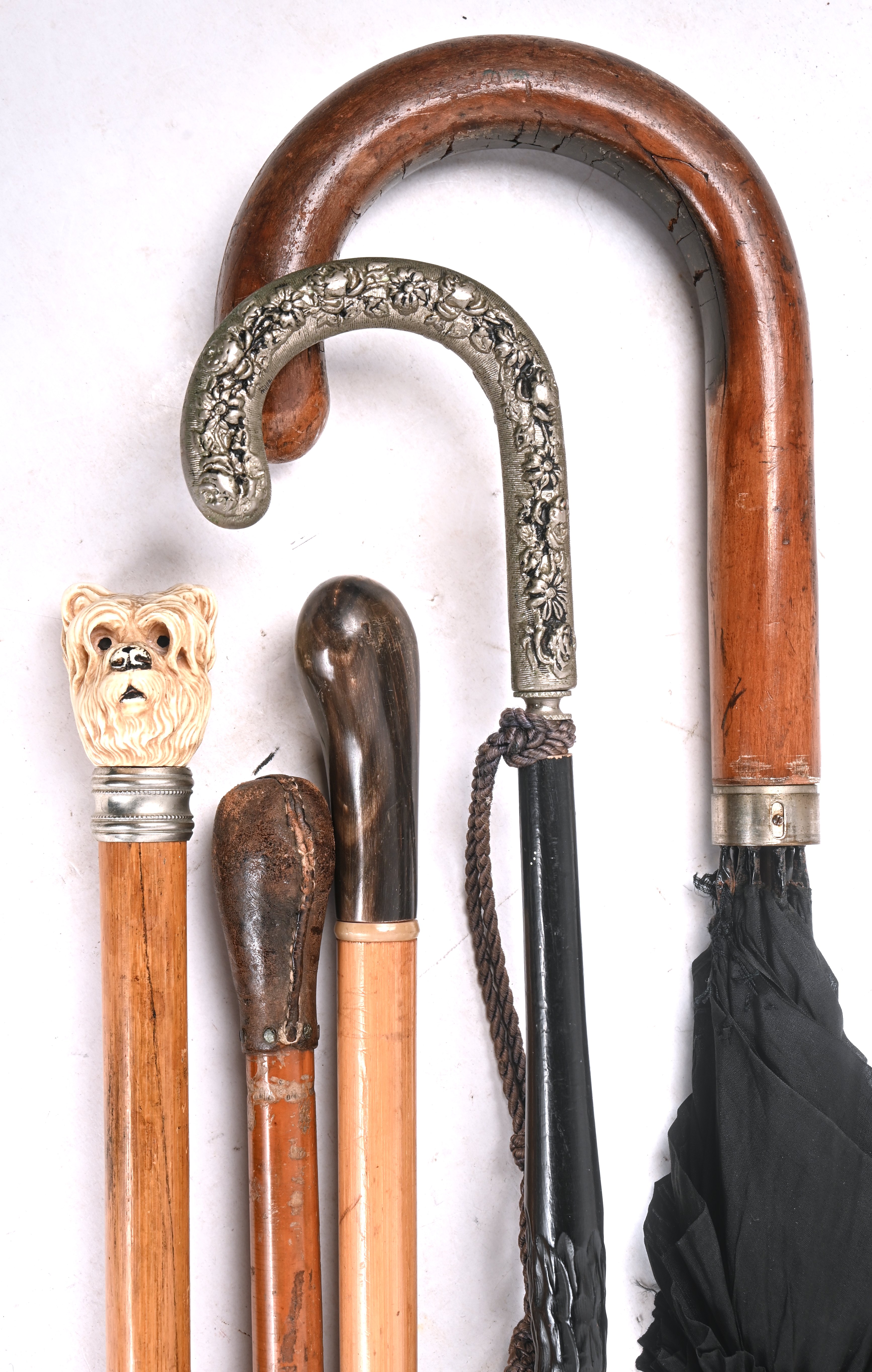 Een lot oude wandelstokken met koppen in diverse materialen: leder, hoorn, kunststof (hondekop), toegevoegd een wandelstok met paraplu (schade a/d stof) en een parasolletje.