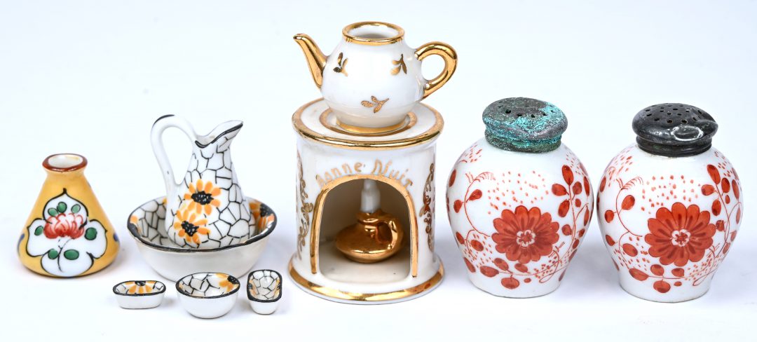 Een lot porseleinen letterkastvulling, het peper- en zoutvaatje met zilveren dop.