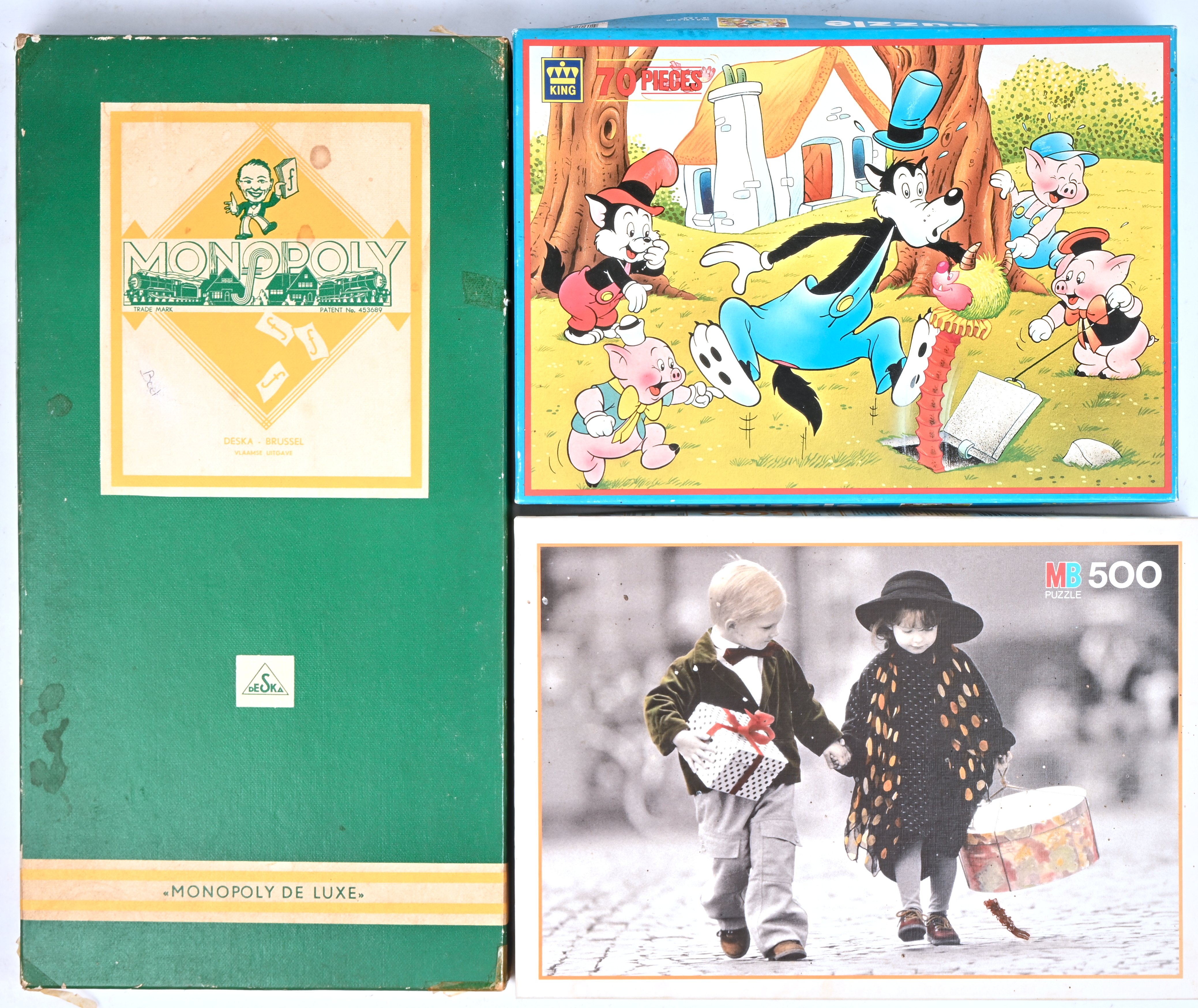 A lot of toys consisting of an old Monopoly game and 2 puzzles.