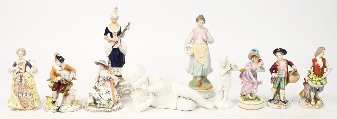#176Een lot van 3 beeldjes, circa 1900, in meerkleurig biscuit.