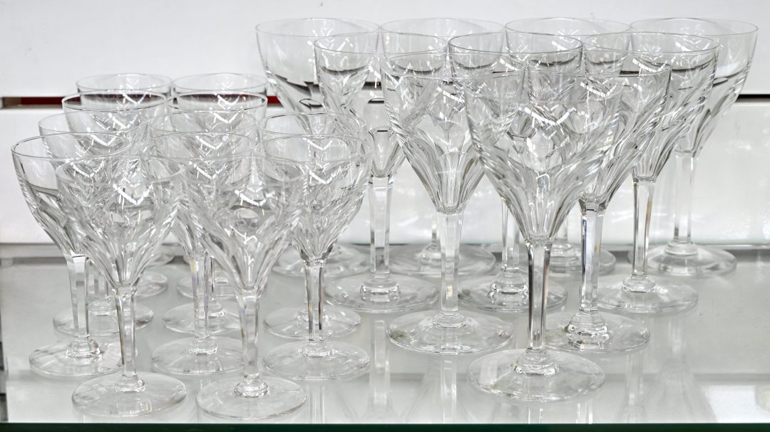 Een set kristallen art deco glazen op voet, 4 formaten. 37 stuks.
