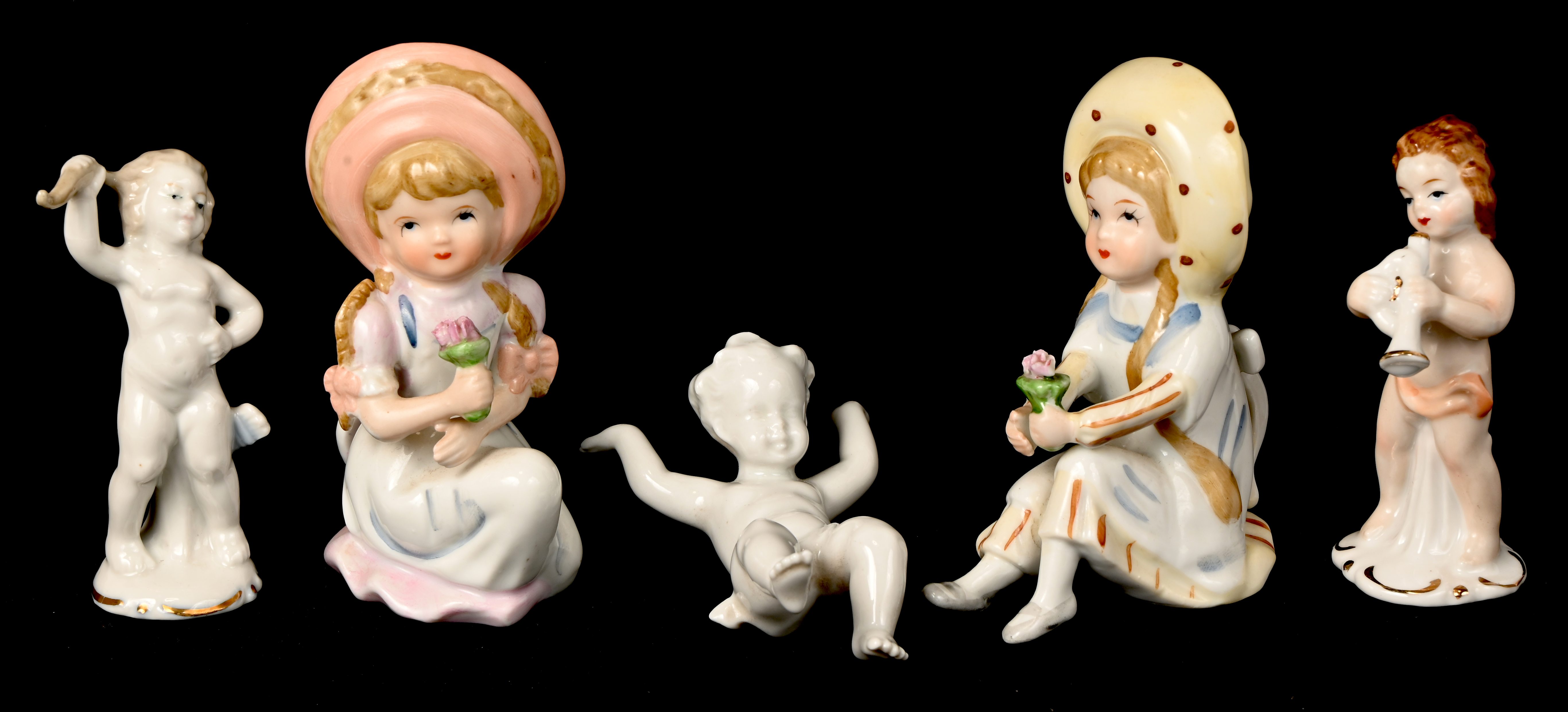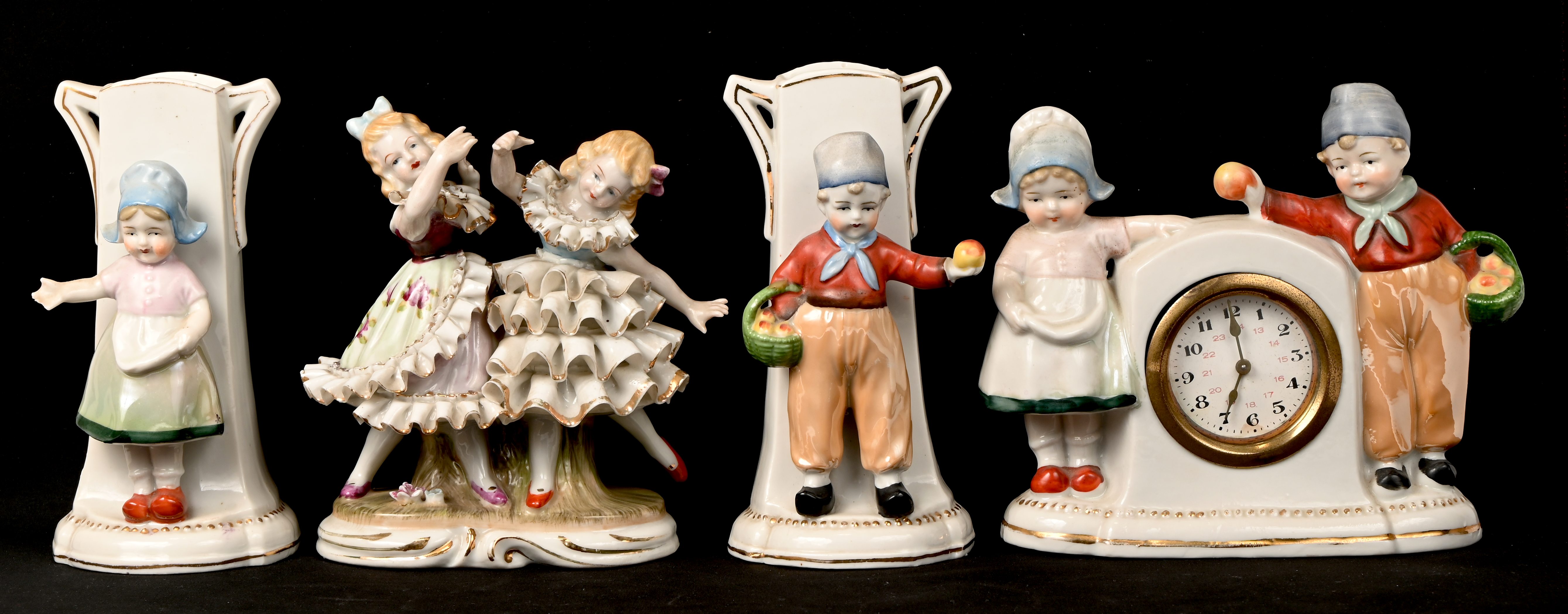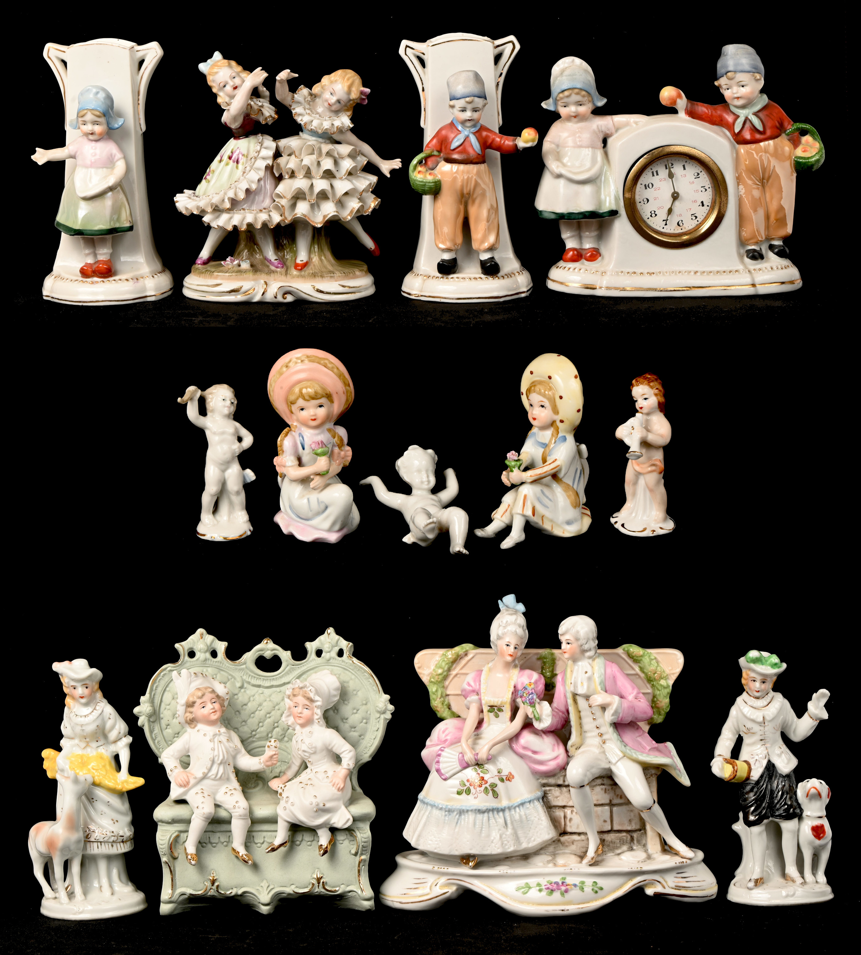 Een lot van 13 beeldjes uit porselein en biscuit met meerdere romantische voorstellingen en een Hollands klokje met 2 vaasjes.