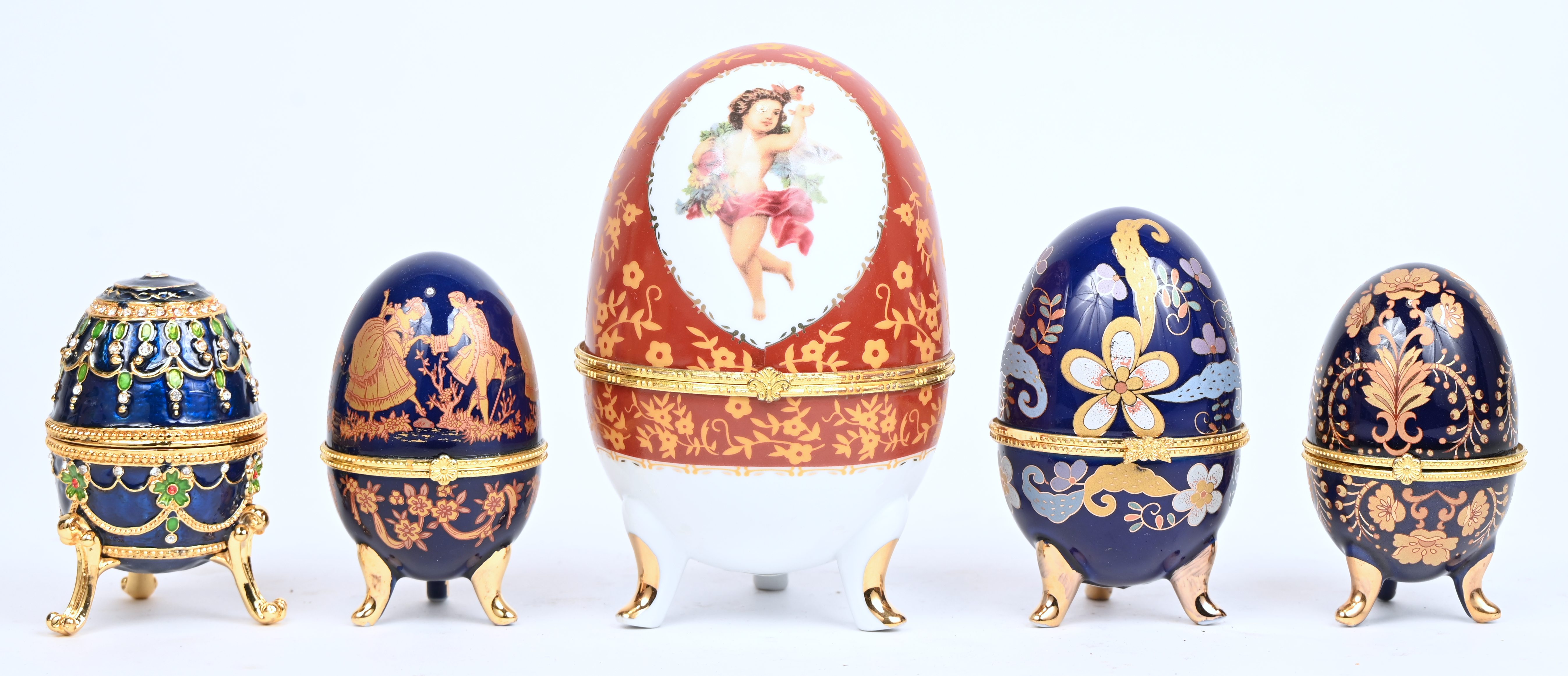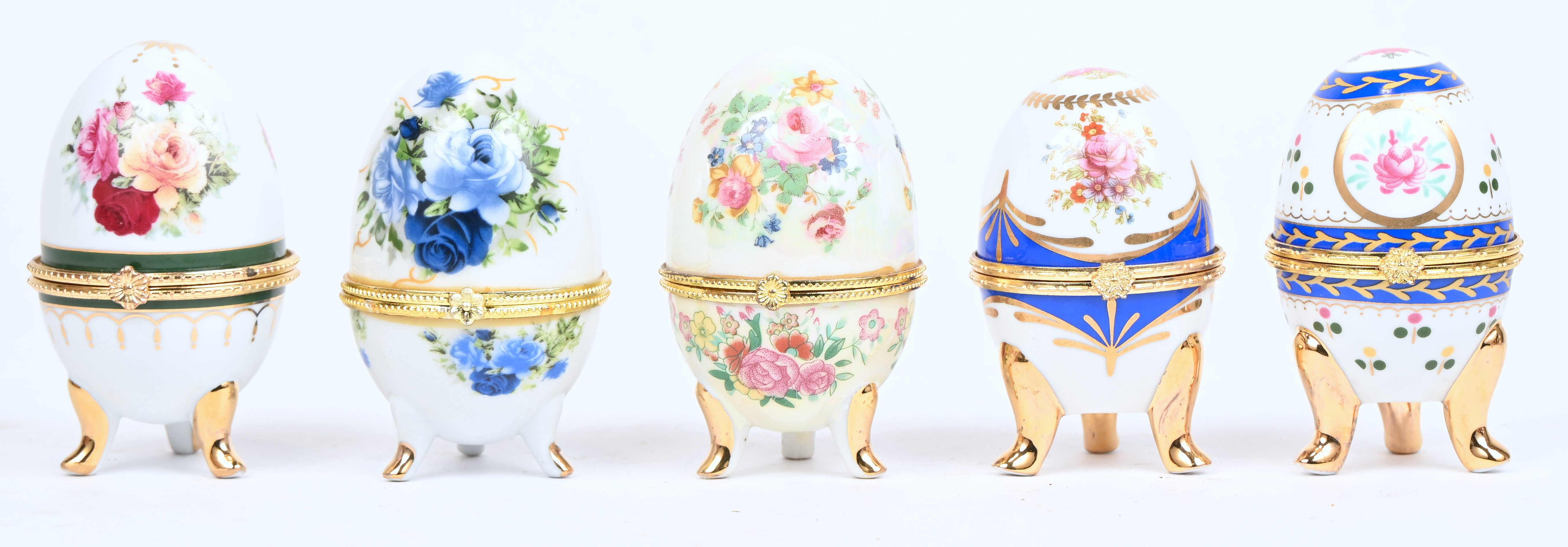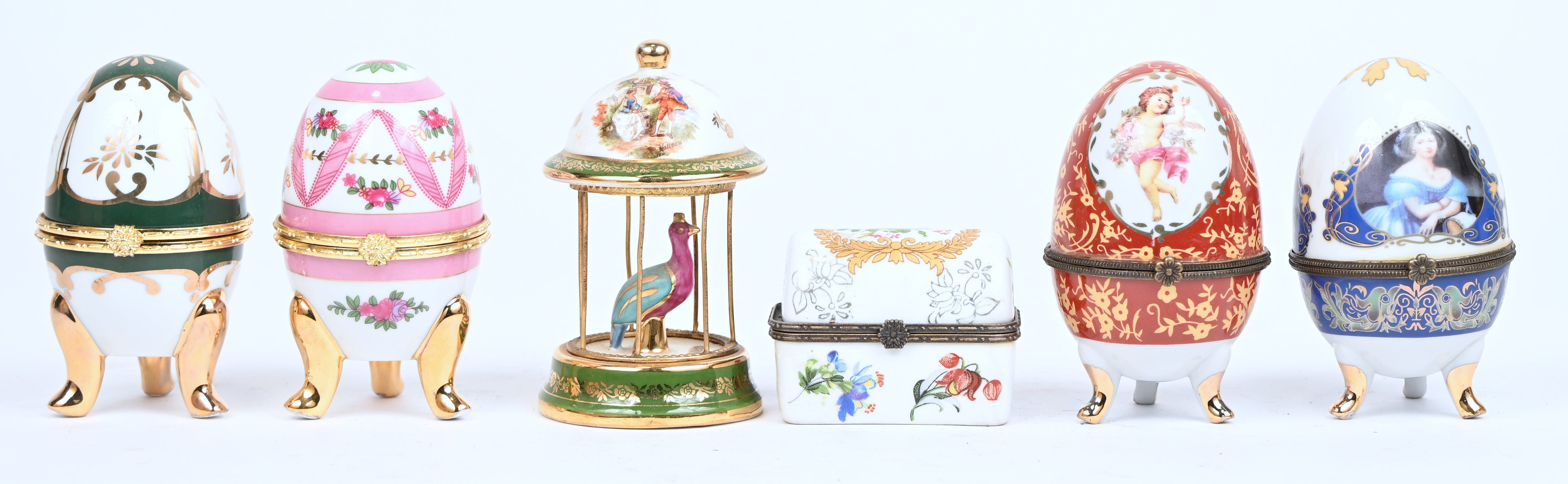 A lot of 14 porcelain egg-shaped jewelry boxes, including a porcelain box and a Limoges birdcage.