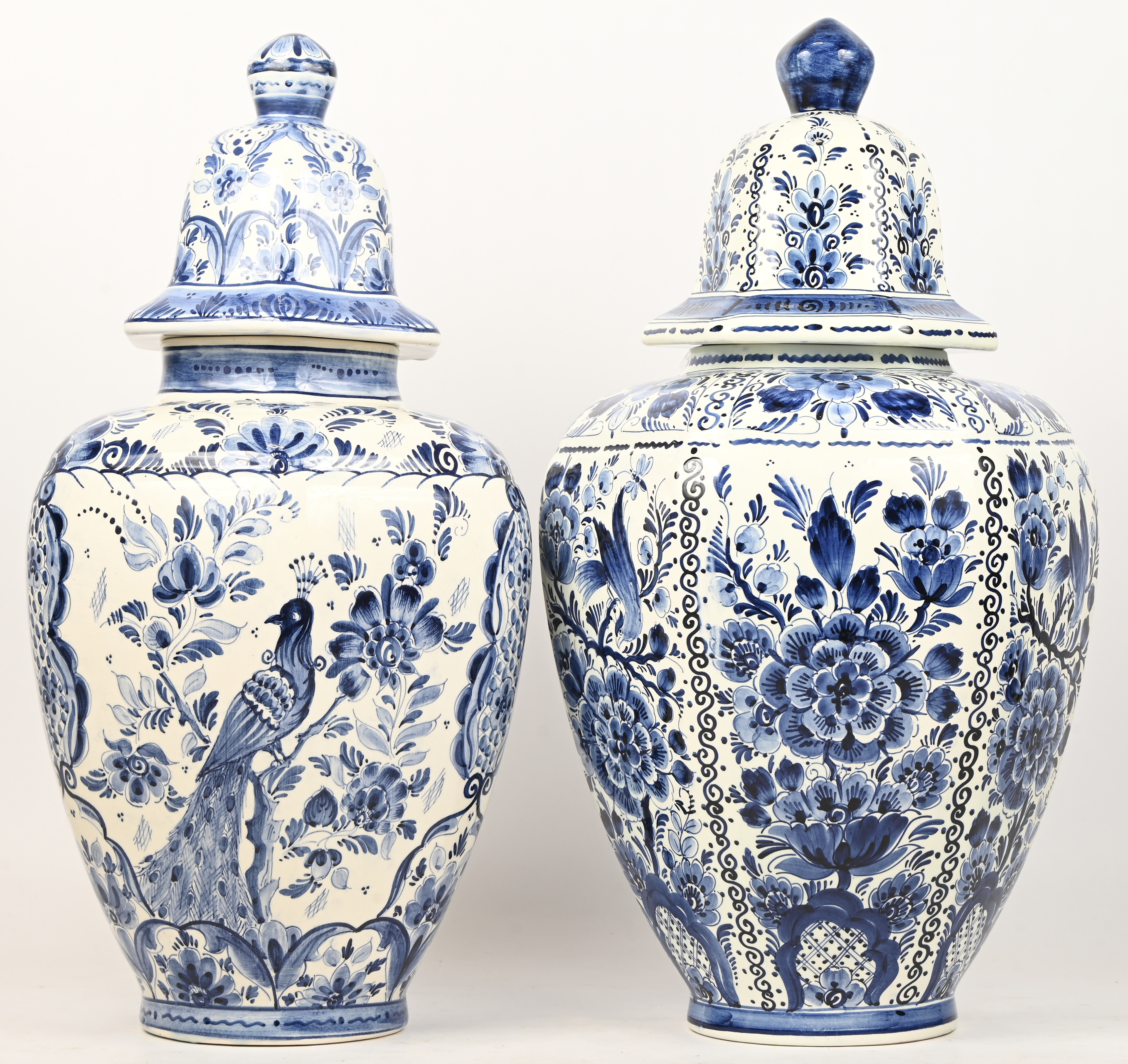 #153Een set van 2 Chinese blauw-witte porseleinen vazen met kinderen in het decor.