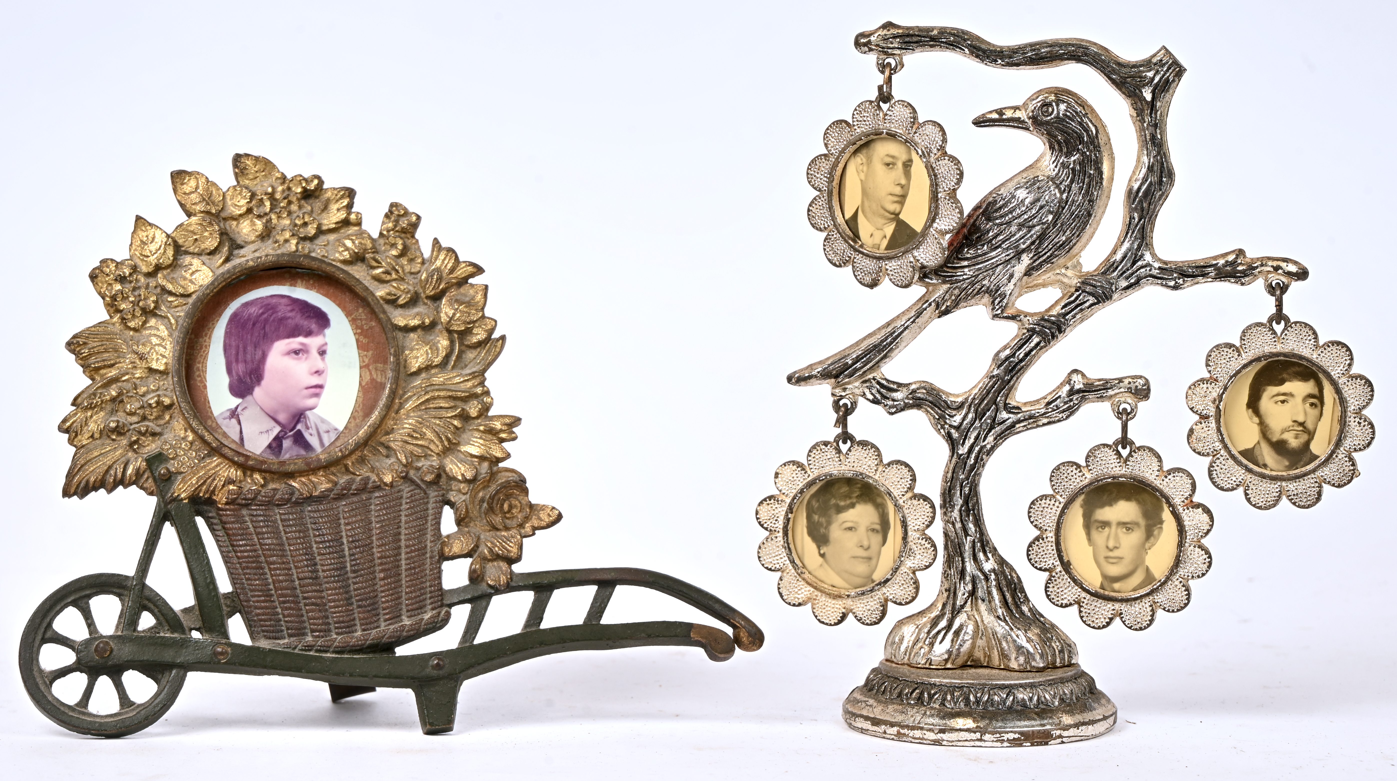 Een lot van 2 fotokaders bestaande uit een messing exemplaar met de foto van een edele jongeman en een verzilverd metalen boom met vogel voor 4 foto’s.