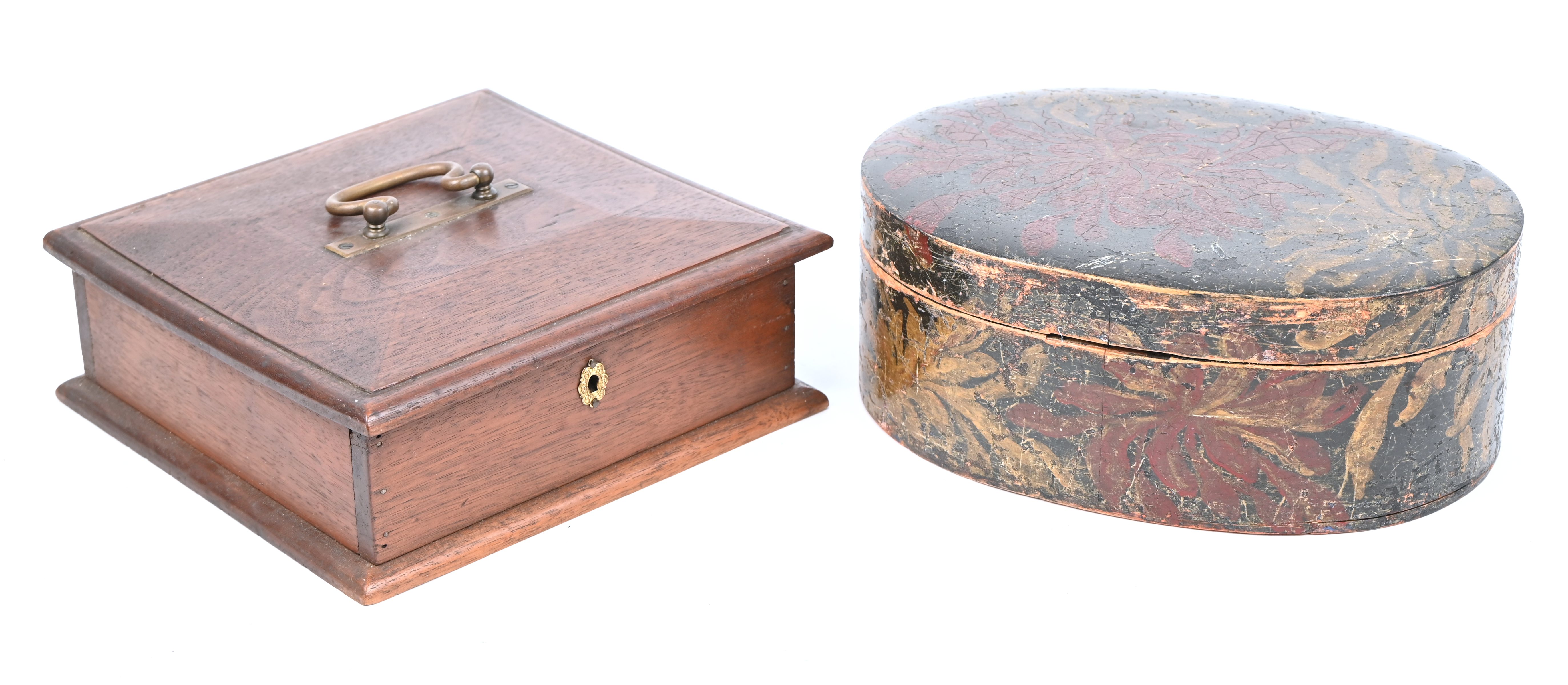 Een lot van 2 oude kistjes, een eikenhouten exemplaar en een floraal beschilderde ovale doos.