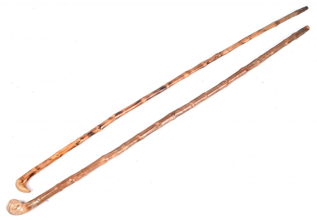 Een lot van 2 oude wandelstokken.
