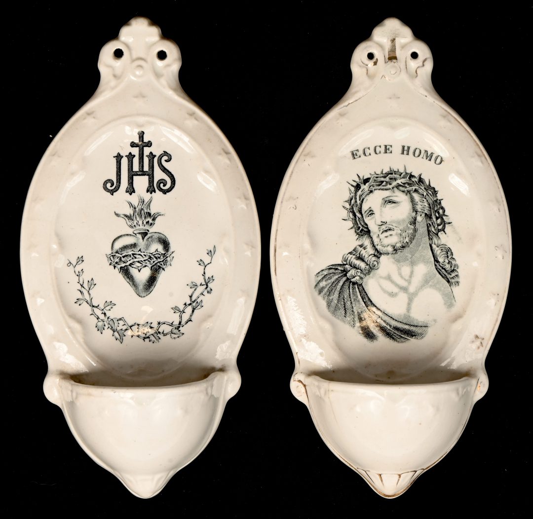 A lot of 2 19th-century porcelain holy water fonts, marked P. Regout, Maastricht. Hairline crack.