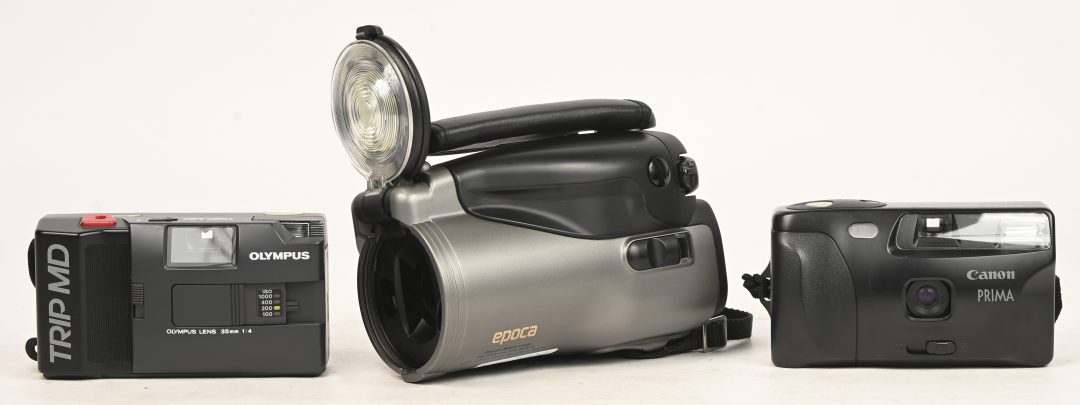 An analog camera, Canon A-1 with manual, lens caps, purchase receipt (1982), and 2 small tripods included. -