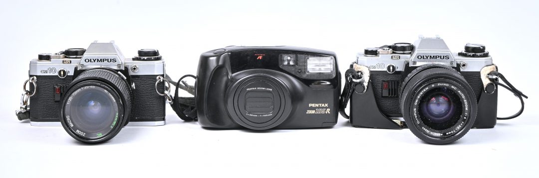 A lot of 3 analog cameras. Olympus OM10 with Zuiko MC auto zoom 1:4 f=35-70 mm, Olympus OM10 with Hanimex macro zoom f=35-70mm 1:3.5-4.5 and a Pentax zoom 105R.