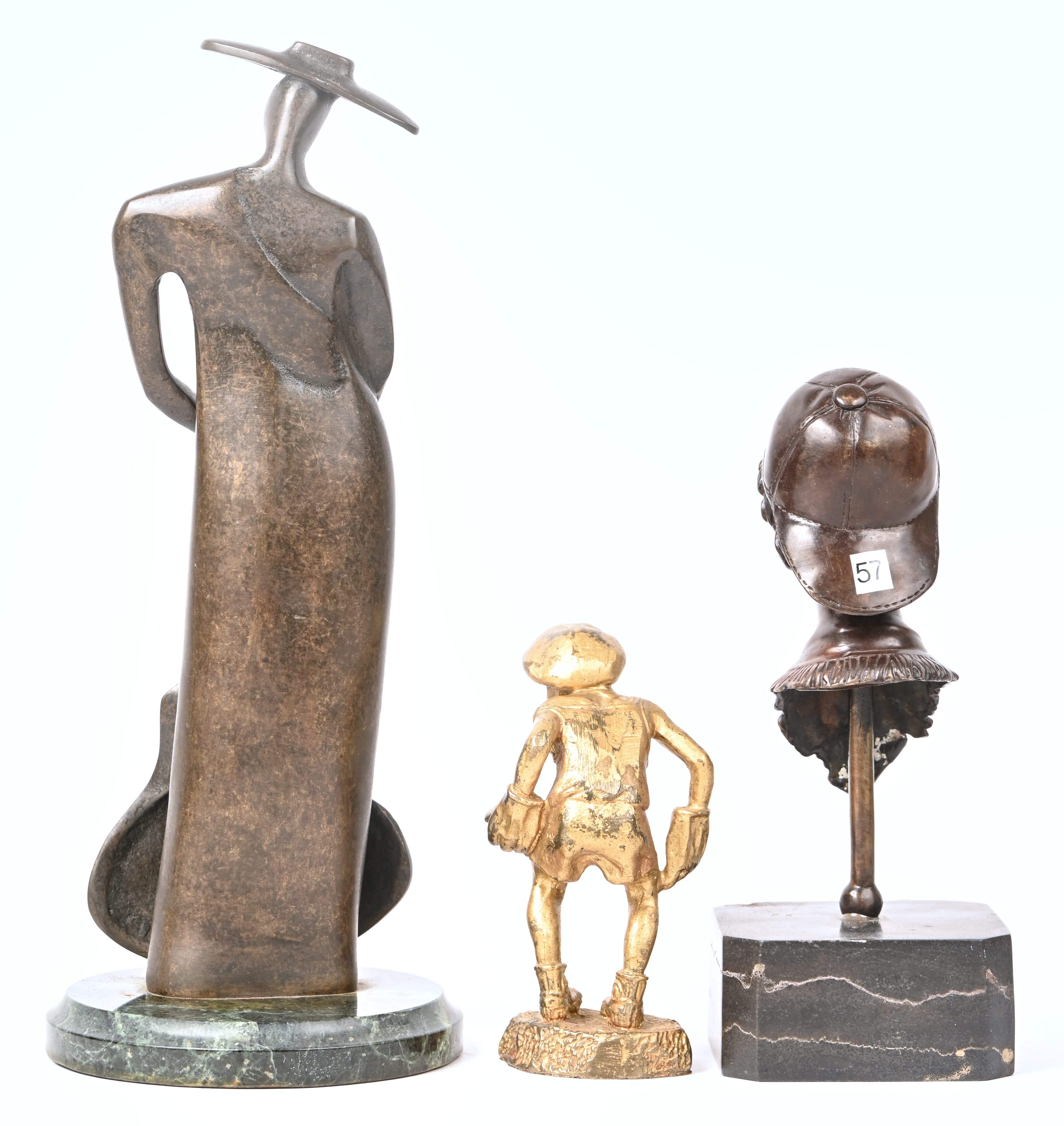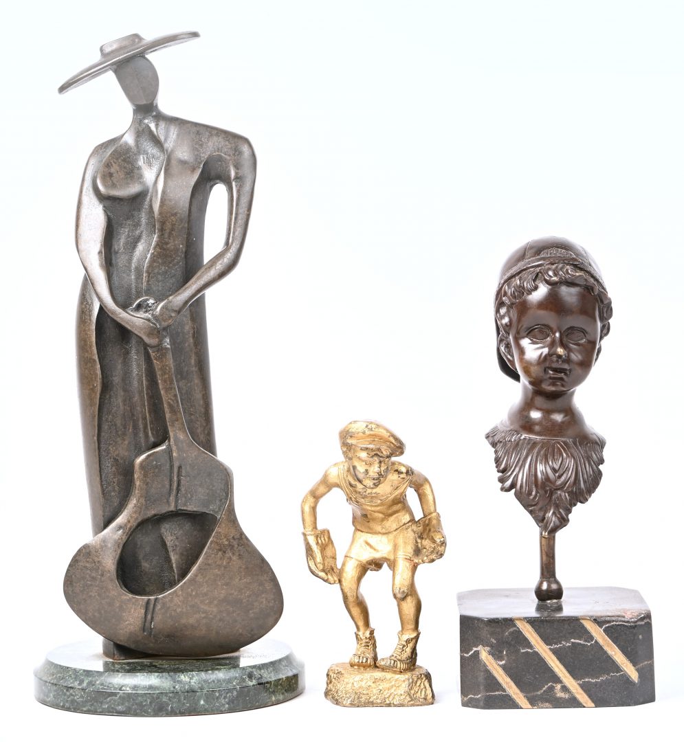 Een lot van 3 bronzen beeldjes, een figuur met gitaar, een jongen met handschoenen en een buste van een jongen met pet.