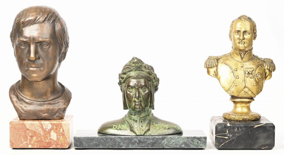 A lot of 3 bronze busts on marble pedestal, Napoleon, Dante, and a Roman.