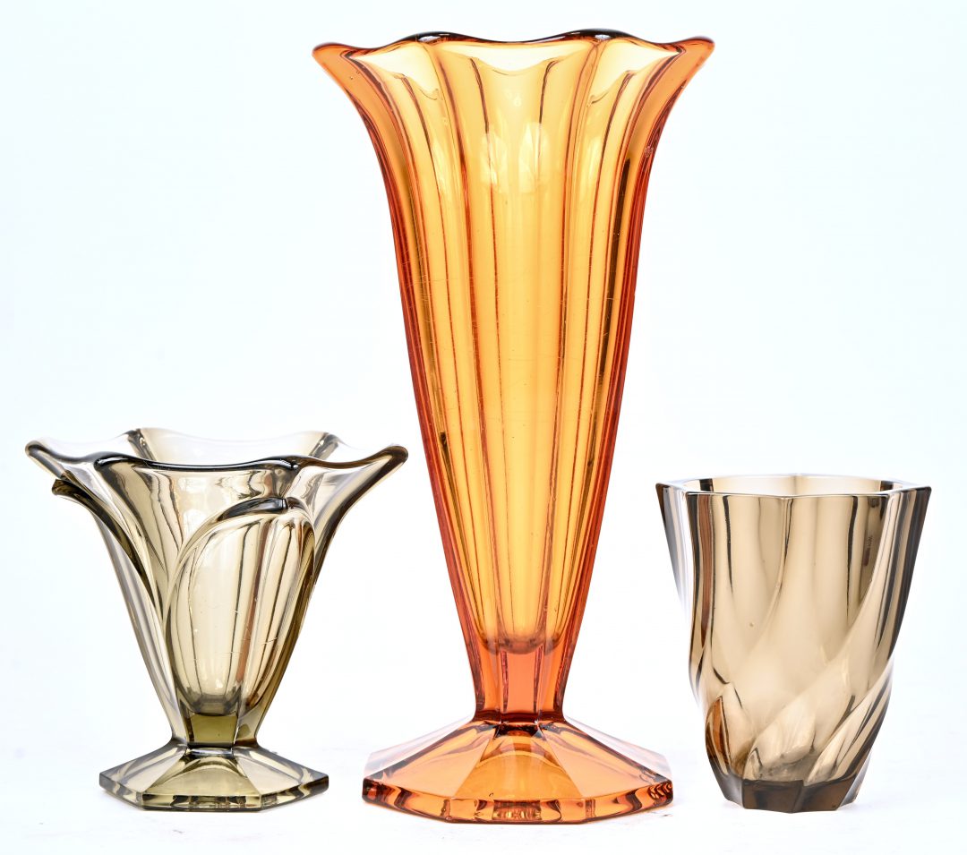 A lot of 3 Art-Deco glass vases, one amber-colored marked Czechoslovakia and 2 in smoked glass, one marked France.