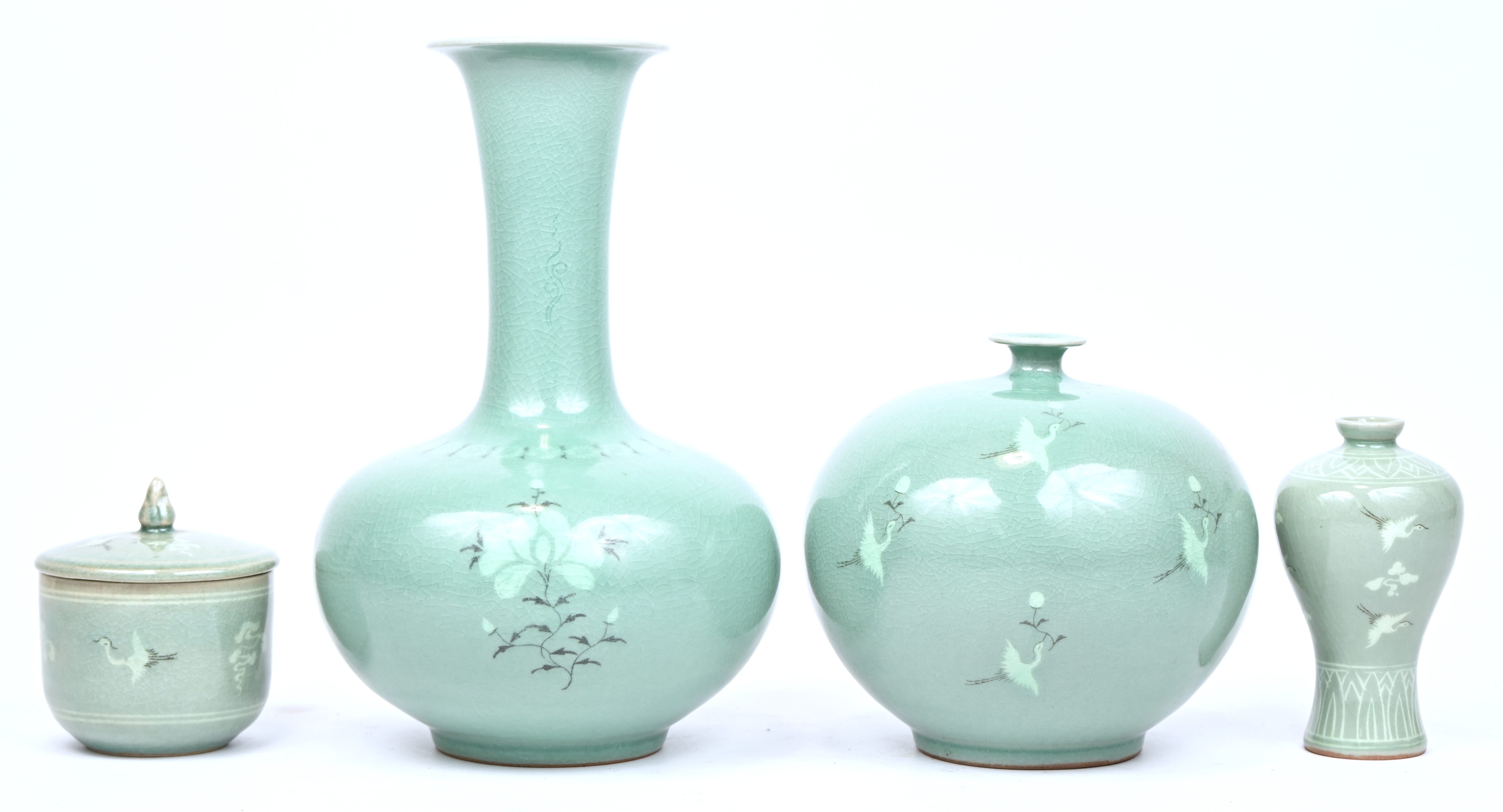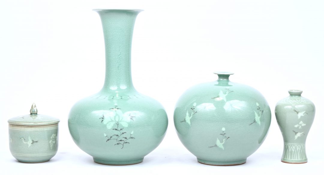 Een lot van 3 Koreaanse celadon porseleinen vazen en een dekselpotje.