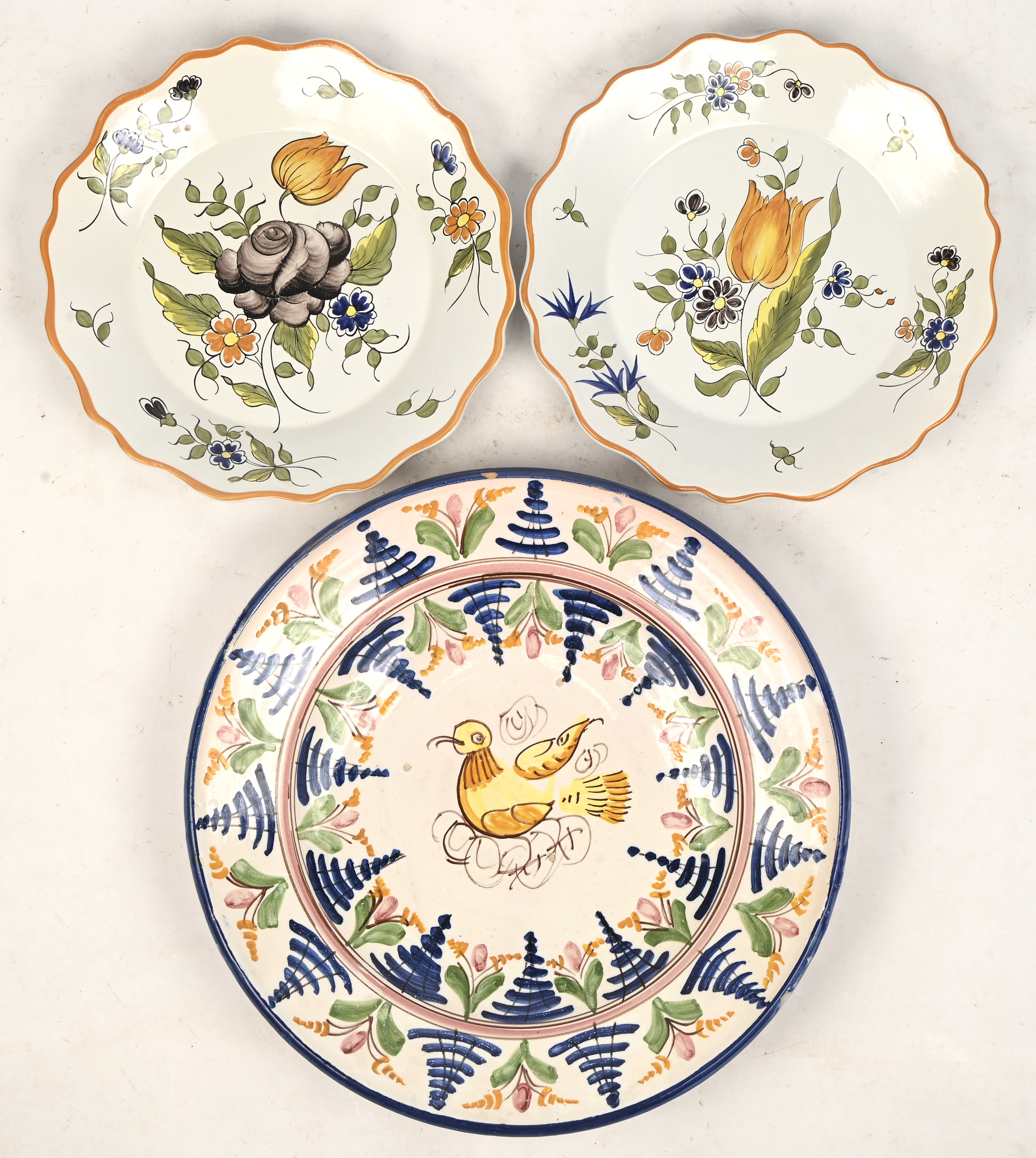 #251Een gevarieerd lot aardewerk bestaande uit vier borden gemerkt BFK, twee opengewerkte bordjes met de afbeelding van kinderen en twee penseelvazen van blauw wit Delfts.
