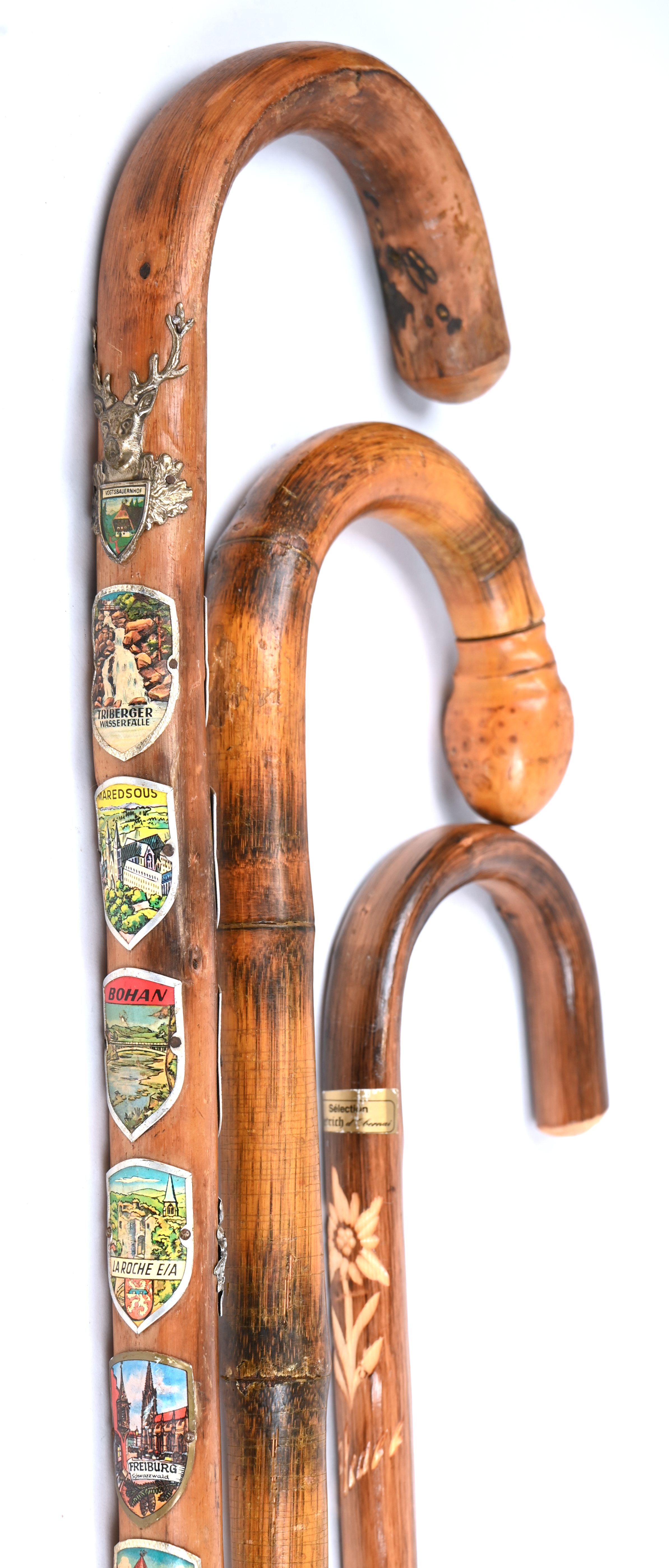 A lot of 3 old walking sticks.