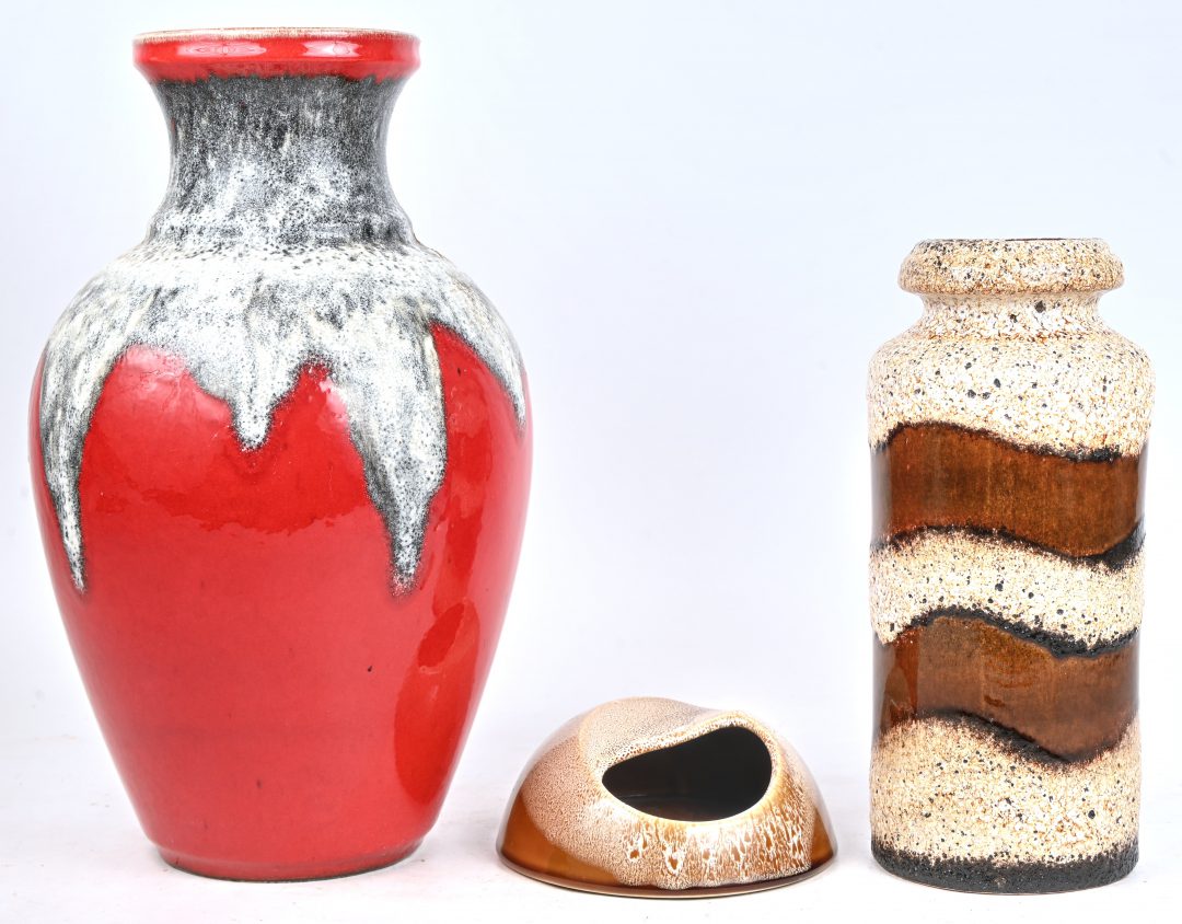 Een lot van 3 vintage keramische voorwerpen, 2 W. Germany vazen en een vide poche. De grootste vaas is hersteld aan de voet.
