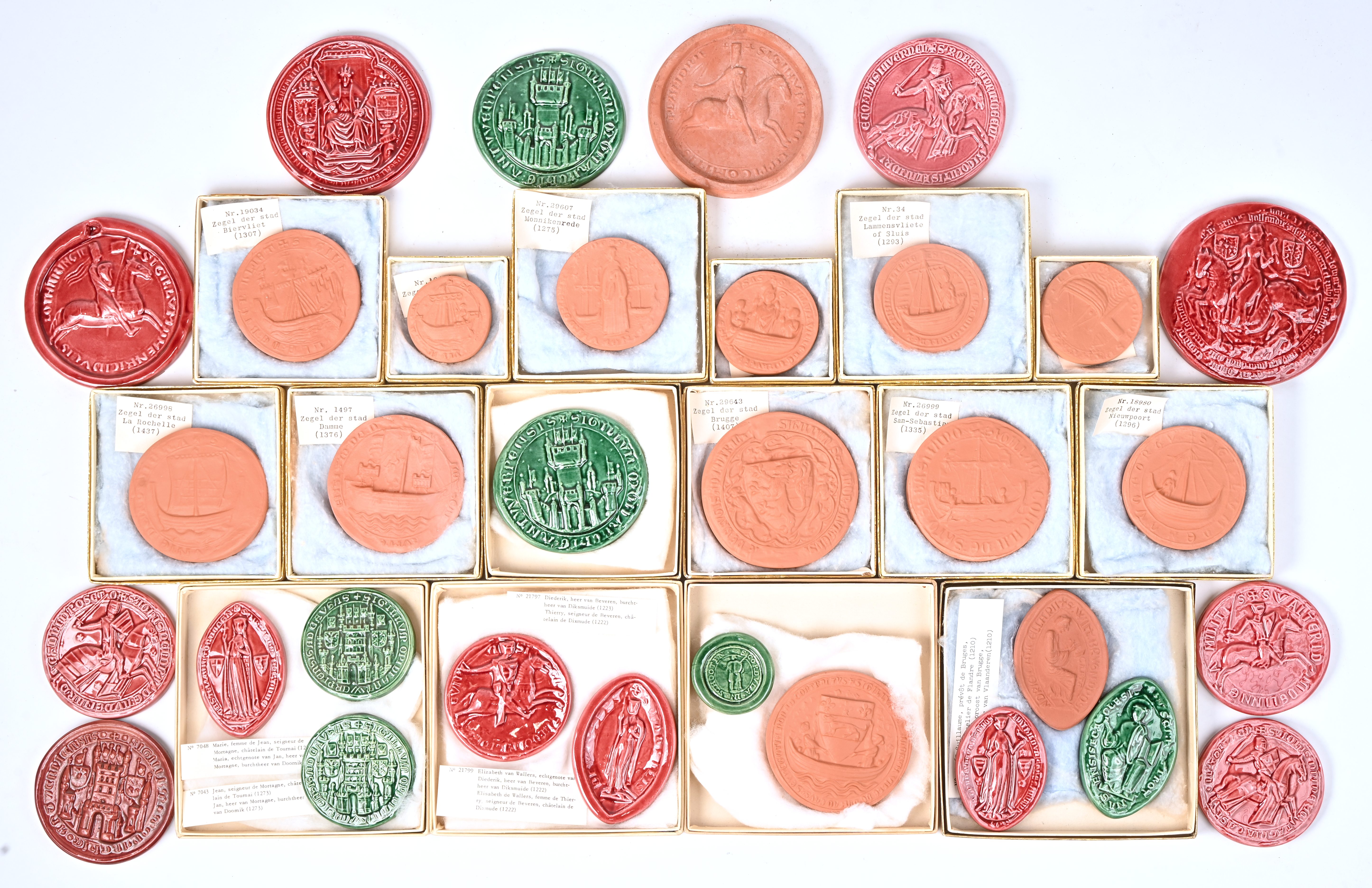 A lot of 32 earthenware reproductions of old seals, from Mary of Burgundy to Henry I, Duke of Lorraine.