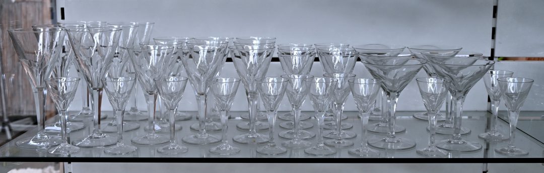 #599Champagnecoupes en portoglaasjes van geslepen kristal.