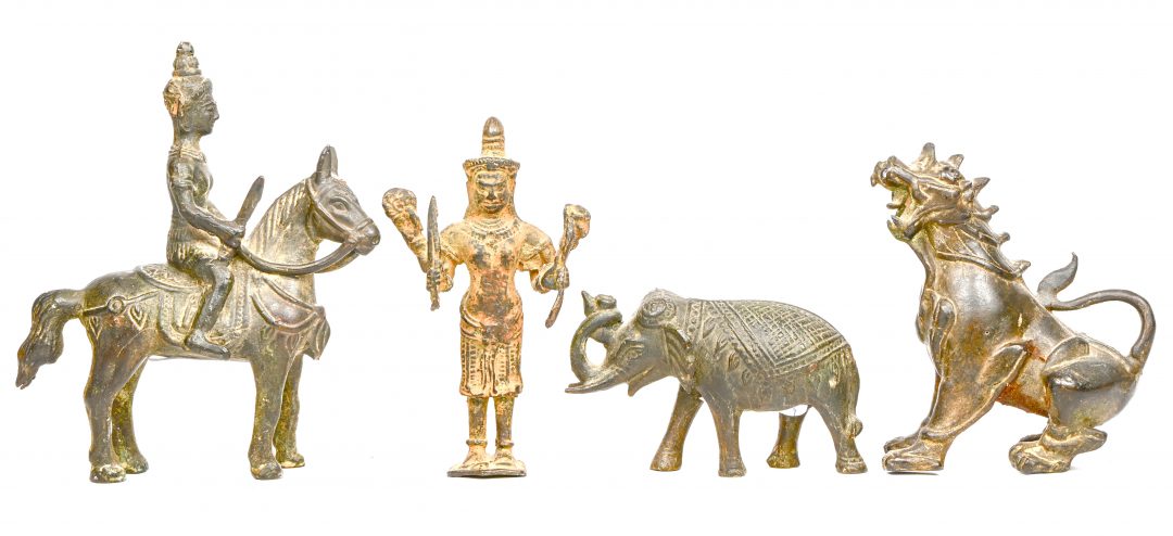 #583Een lot van 4 deels vergulde bronskleurige zamakken muzikanten en een tempelwachter van Zuid-Oost-Aziatische herkomst.