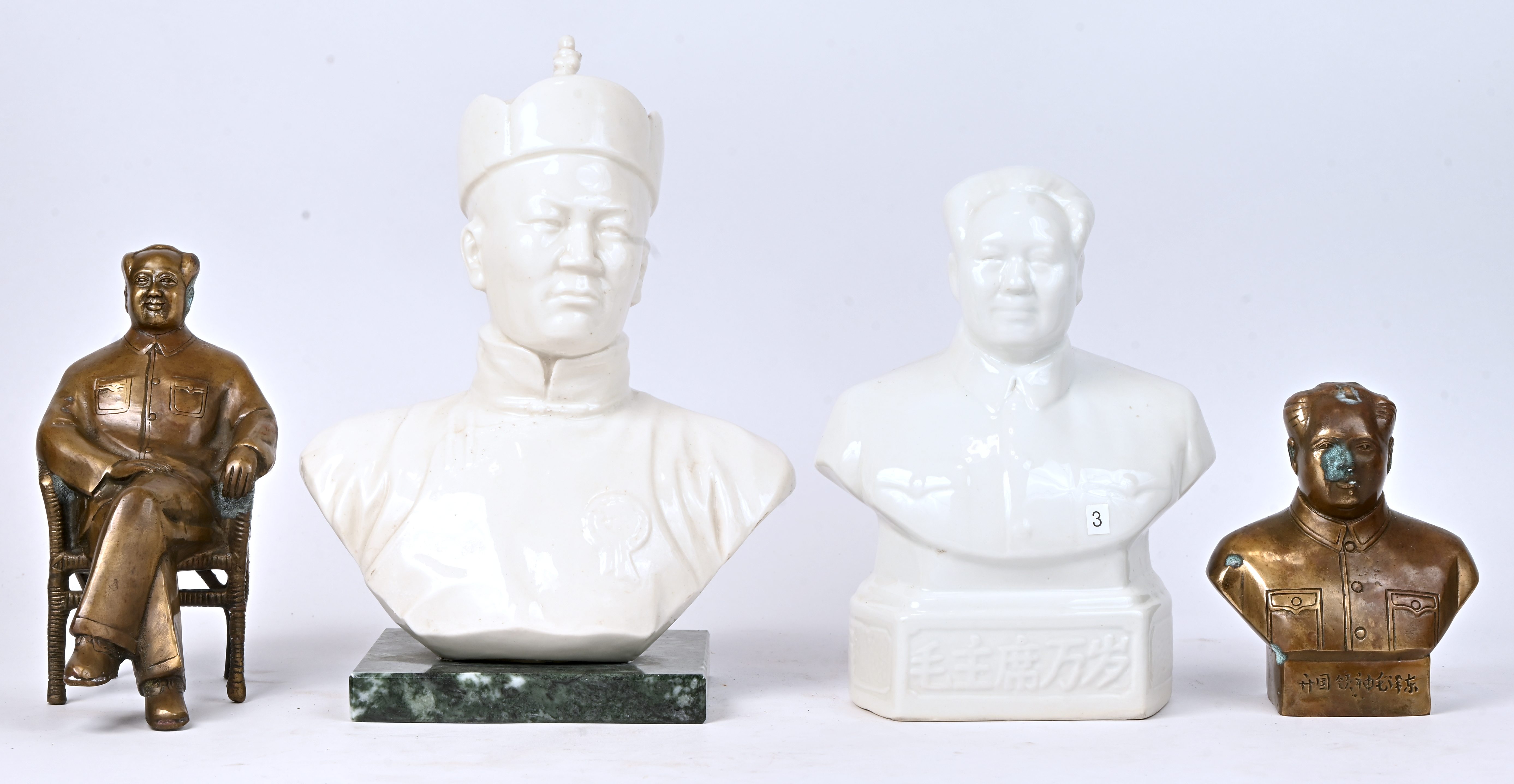 A lot of 4 busts, 3 x Mao Zedong and 1 other, copper and porcelain.