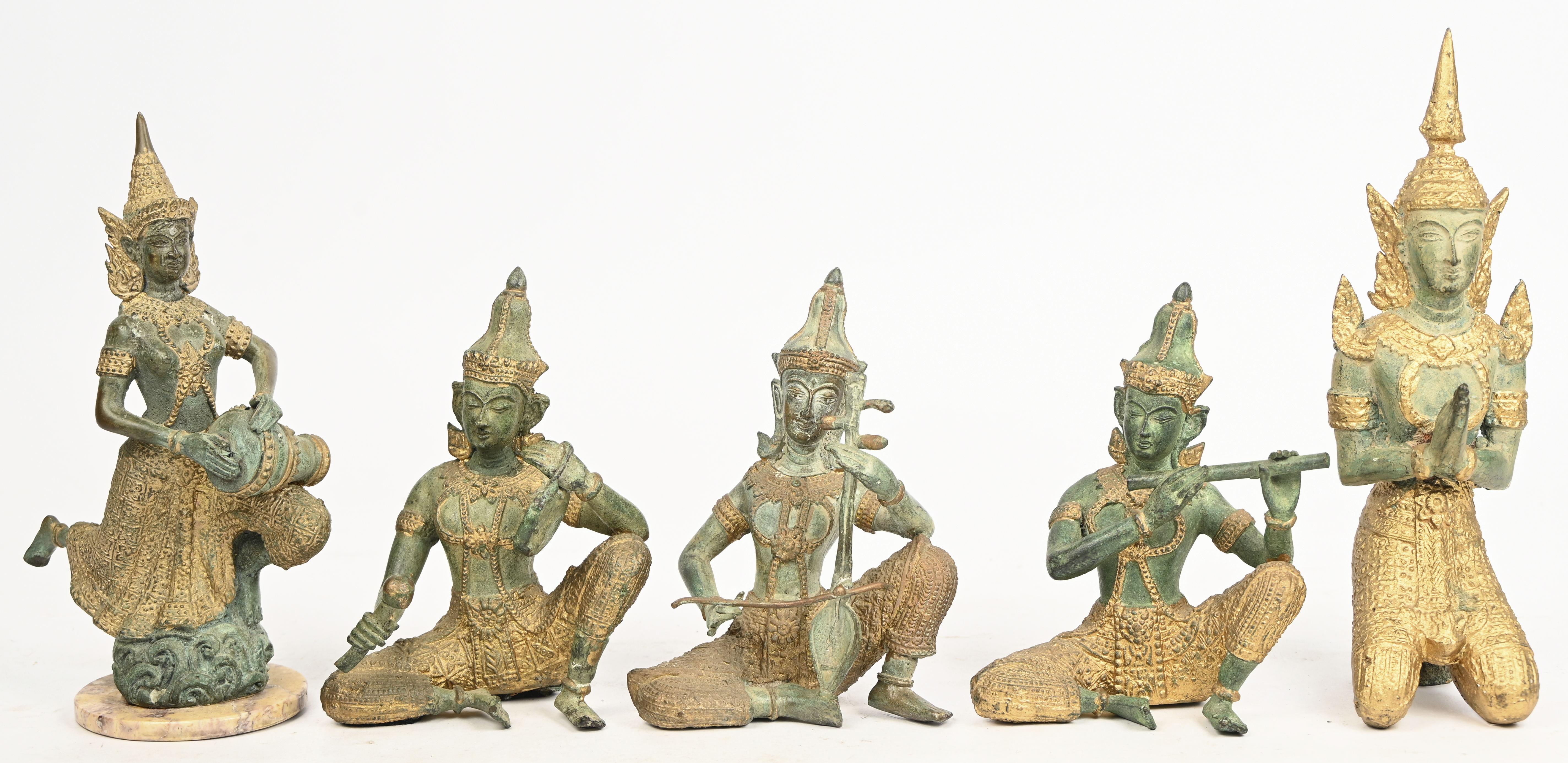 A lot of 4 partially gilt bronze-colored zamak musicians and a temple guardian of Southeast Asian origin.