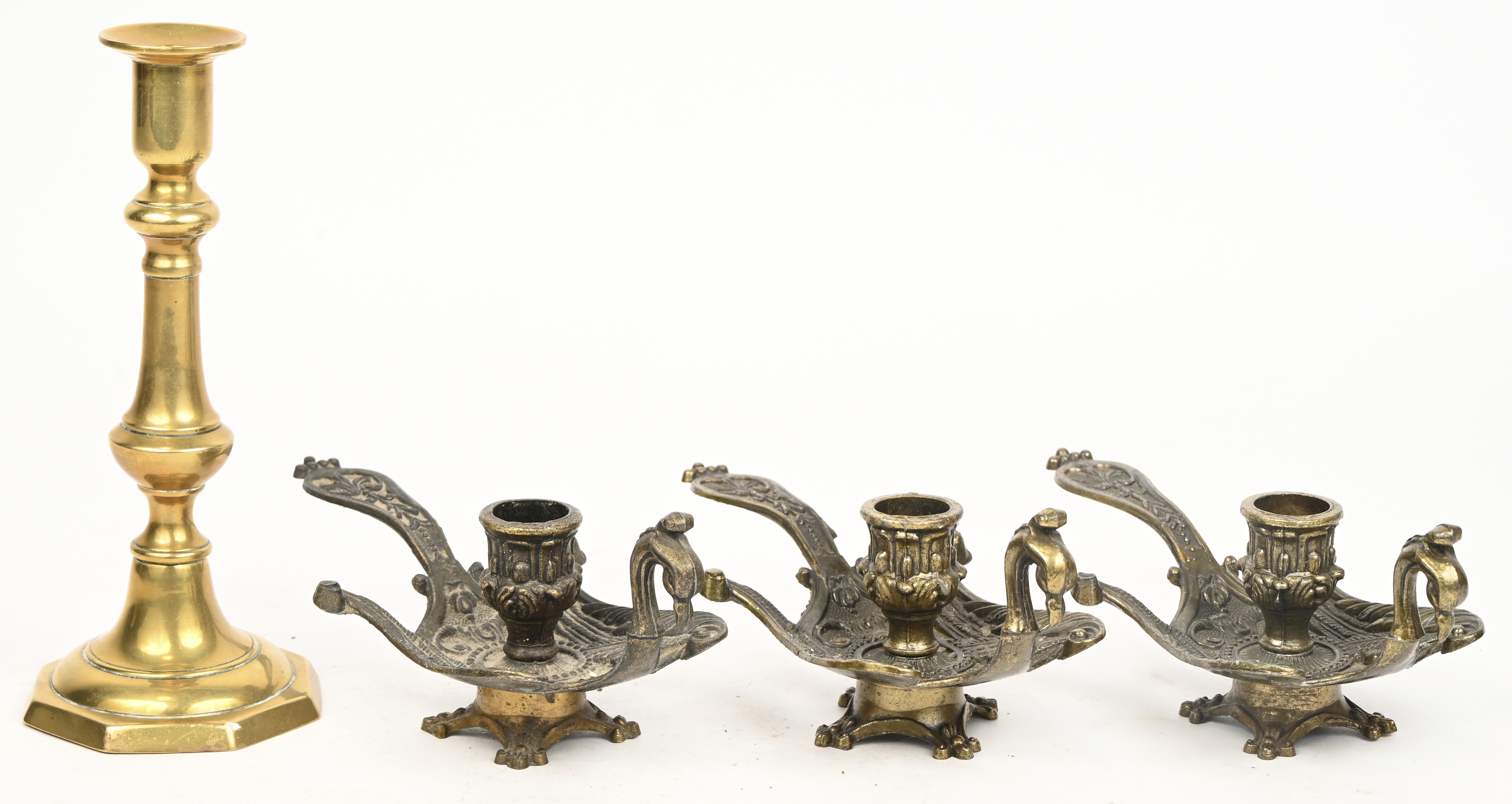 Een oud koperen dekselpotje gedecoreerd met guirlandes en een figuur.