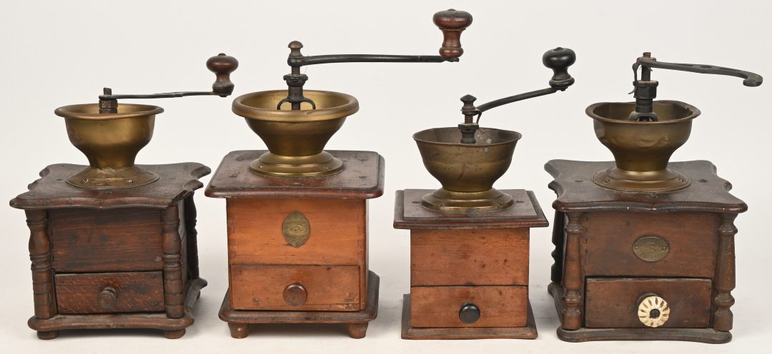 A lot of 4 old oil lamps, accompanied by a silver-plated metal candle holder with a glass hurricane, a lidded pot, and a chrome metal pump.No longer availableOnline onlyDim. h 49.5 cm (windlicht)Estimate: € 25 / 35 -