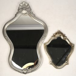 #207Twee spiegeltjes in zilverkleurige kaders, barokke stijl.