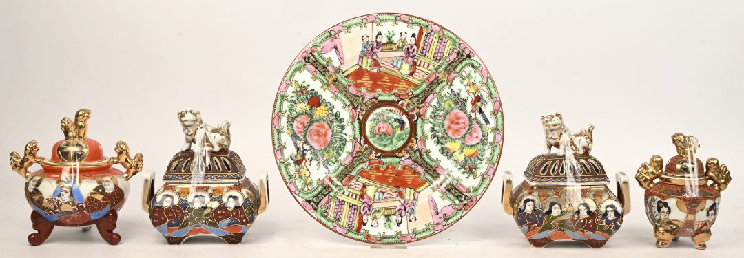 #220Een lot van 4 Japanse Imari en 2 Chinese porseleinen borden in Qianlong stijl. De Chinese borden met haarlijn.