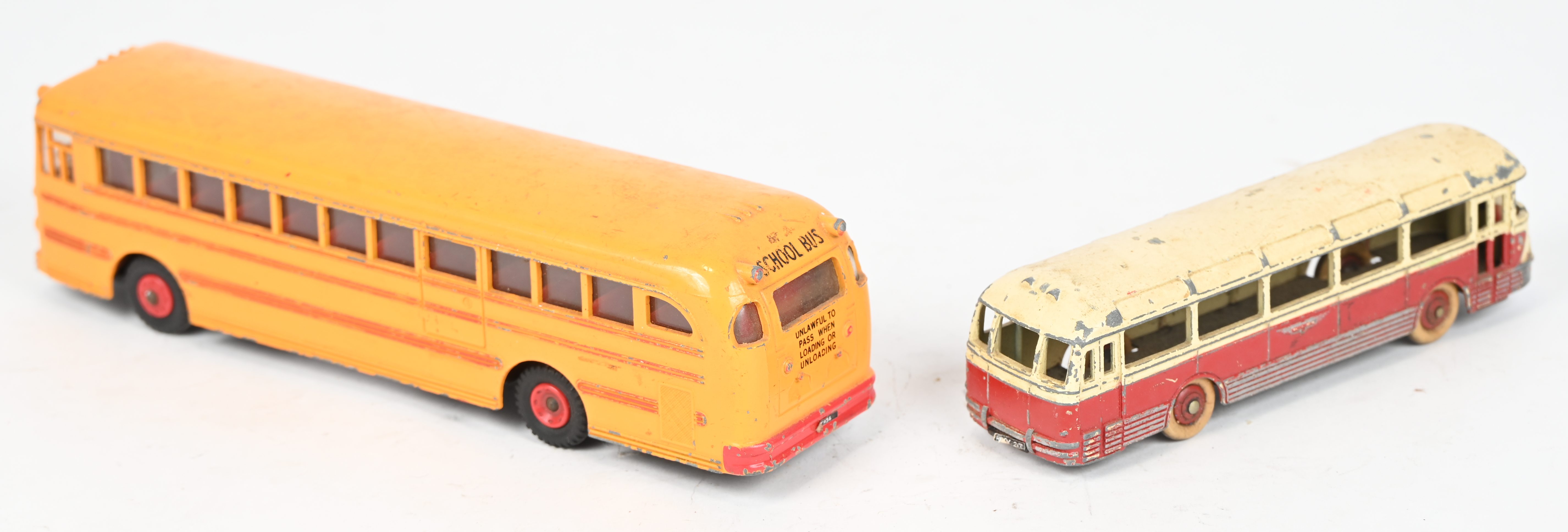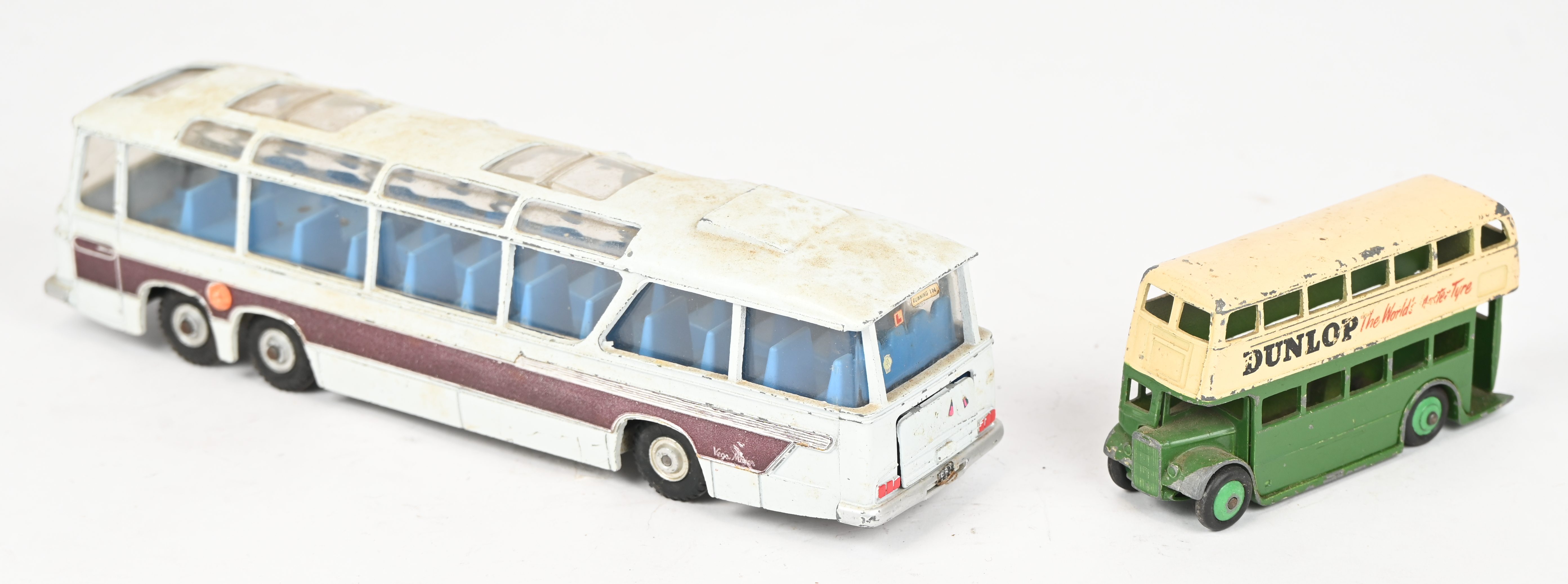 Een lot van 4 vintage die-cast bussen: Wayne school bus, Vega Major luxury coach, Autocar Chausson 29F en Dunlop dubbeldekker model 290.