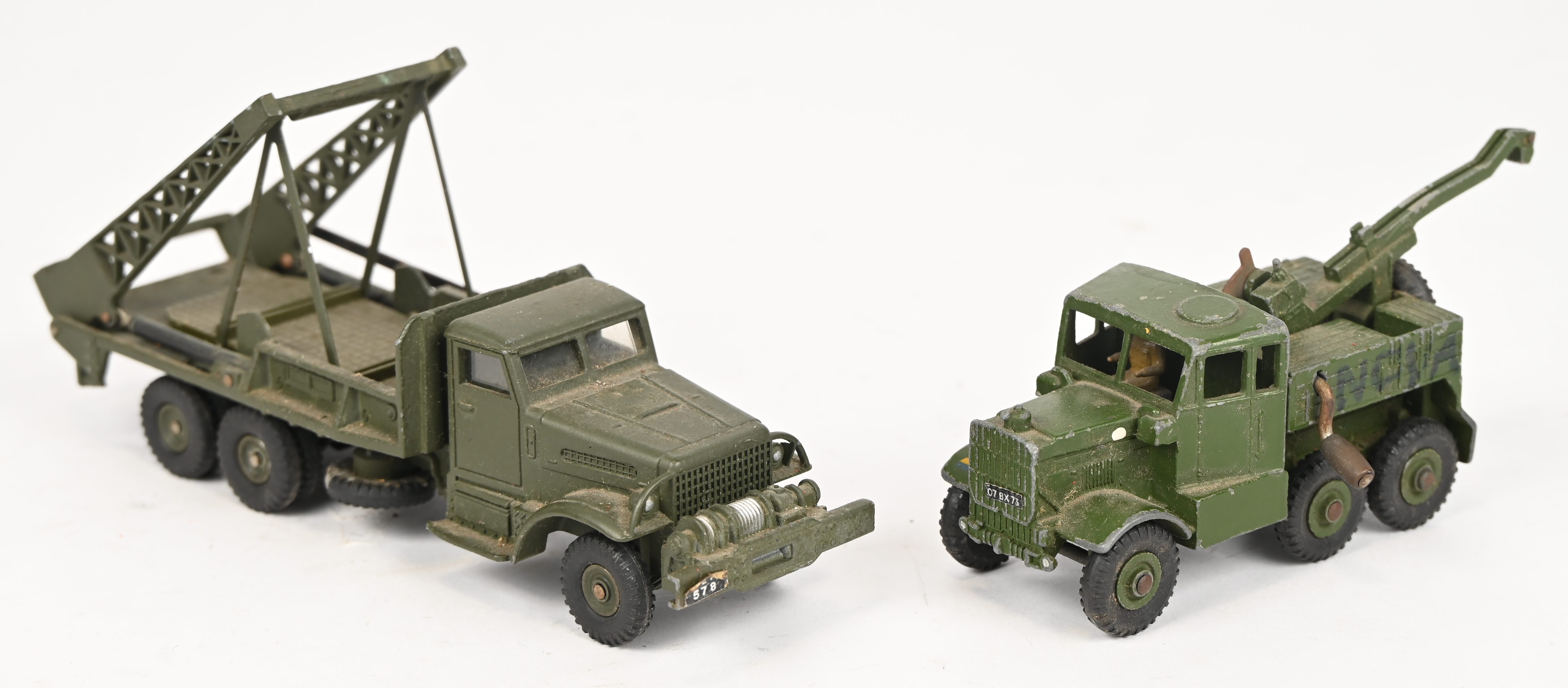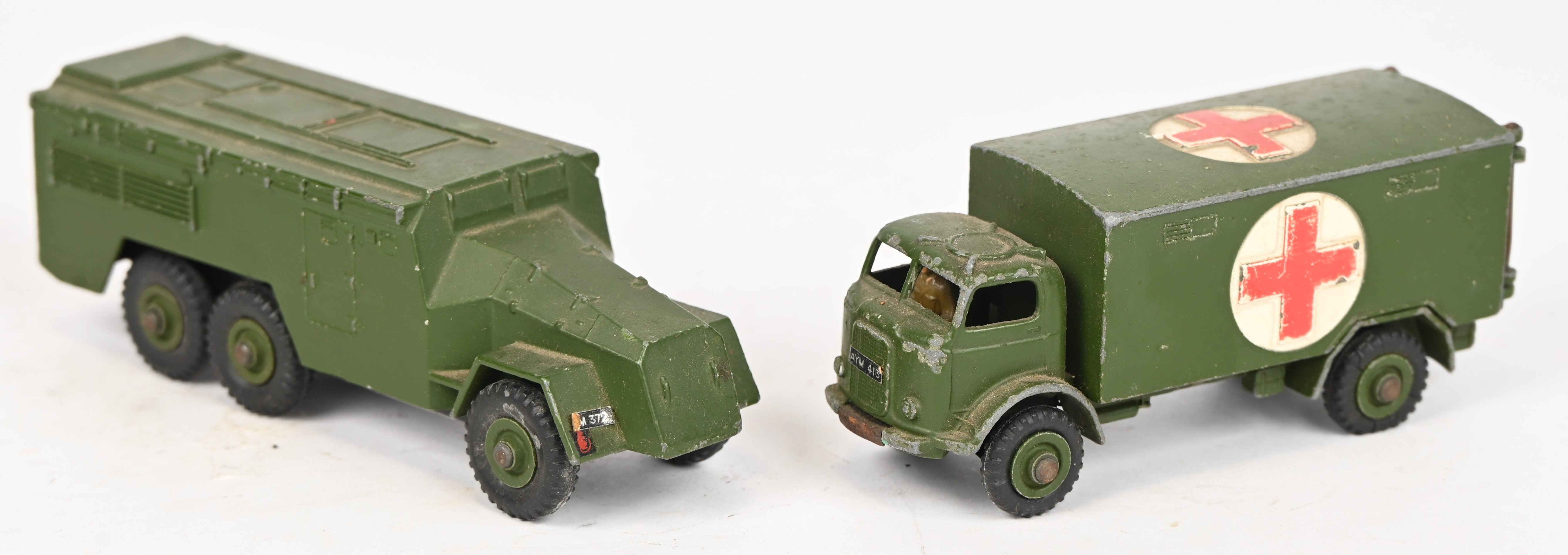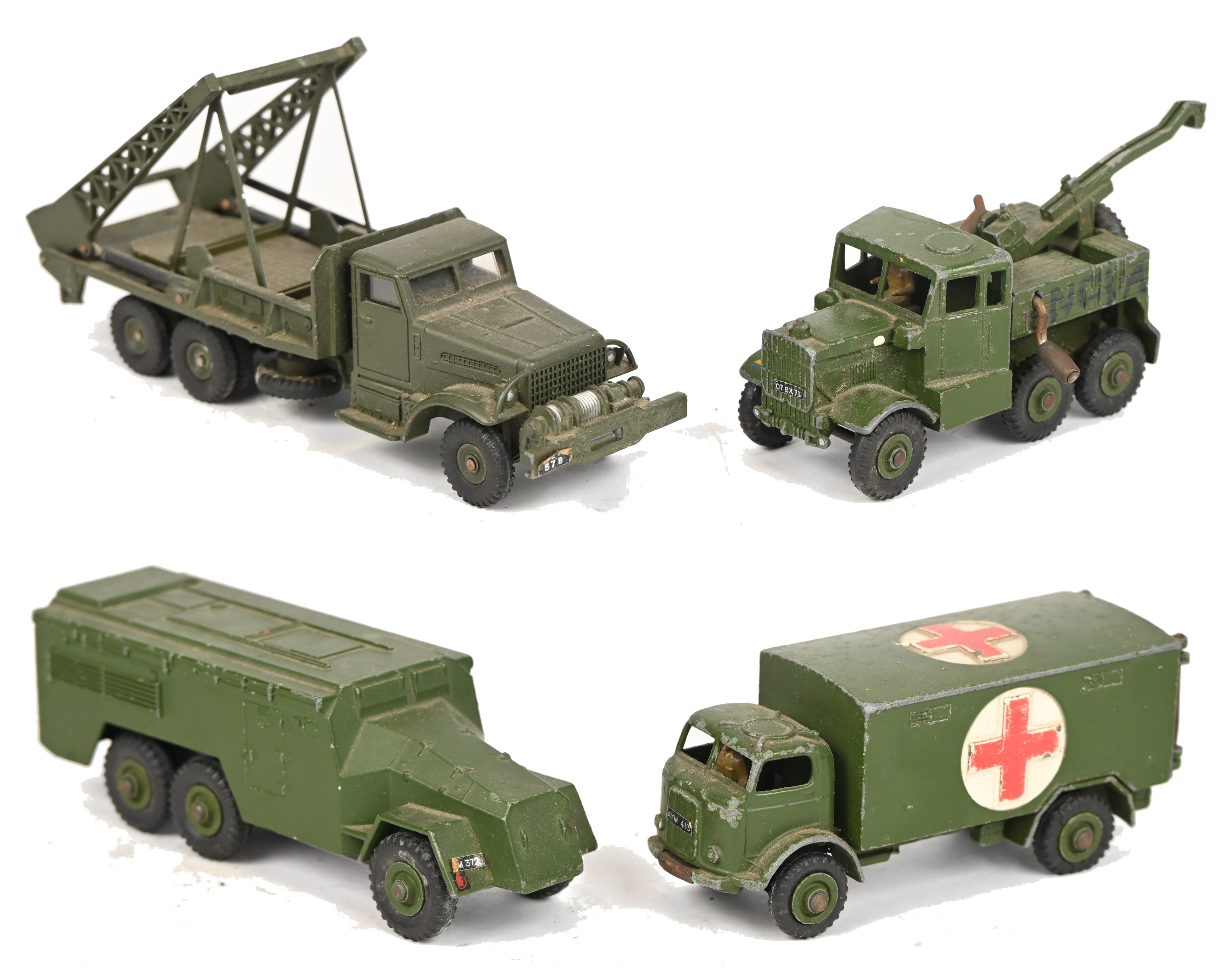 Een lot van 4 vintage die-cast legervoertuigen: Armoured command vehicle - 677, Recovery tractor - 661, Military ambulance - 626 en Brockway - 884.
