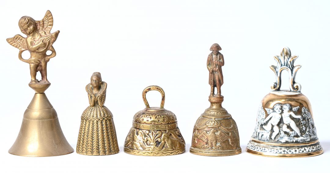 Een lot van 5 belletjes, 4 x messing/brons en een porseleinen gemerkt Capodimonte.