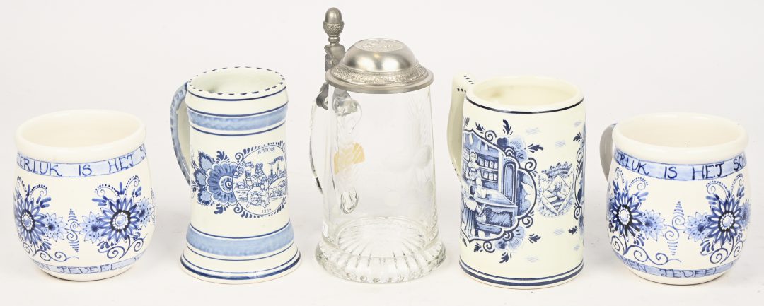 Een lot tin, waarvan 3 bekers gemerkt “Fecit VCM”, en een schaal met lepel. Bijgevoegd 2 verzilverde schaaltjes.