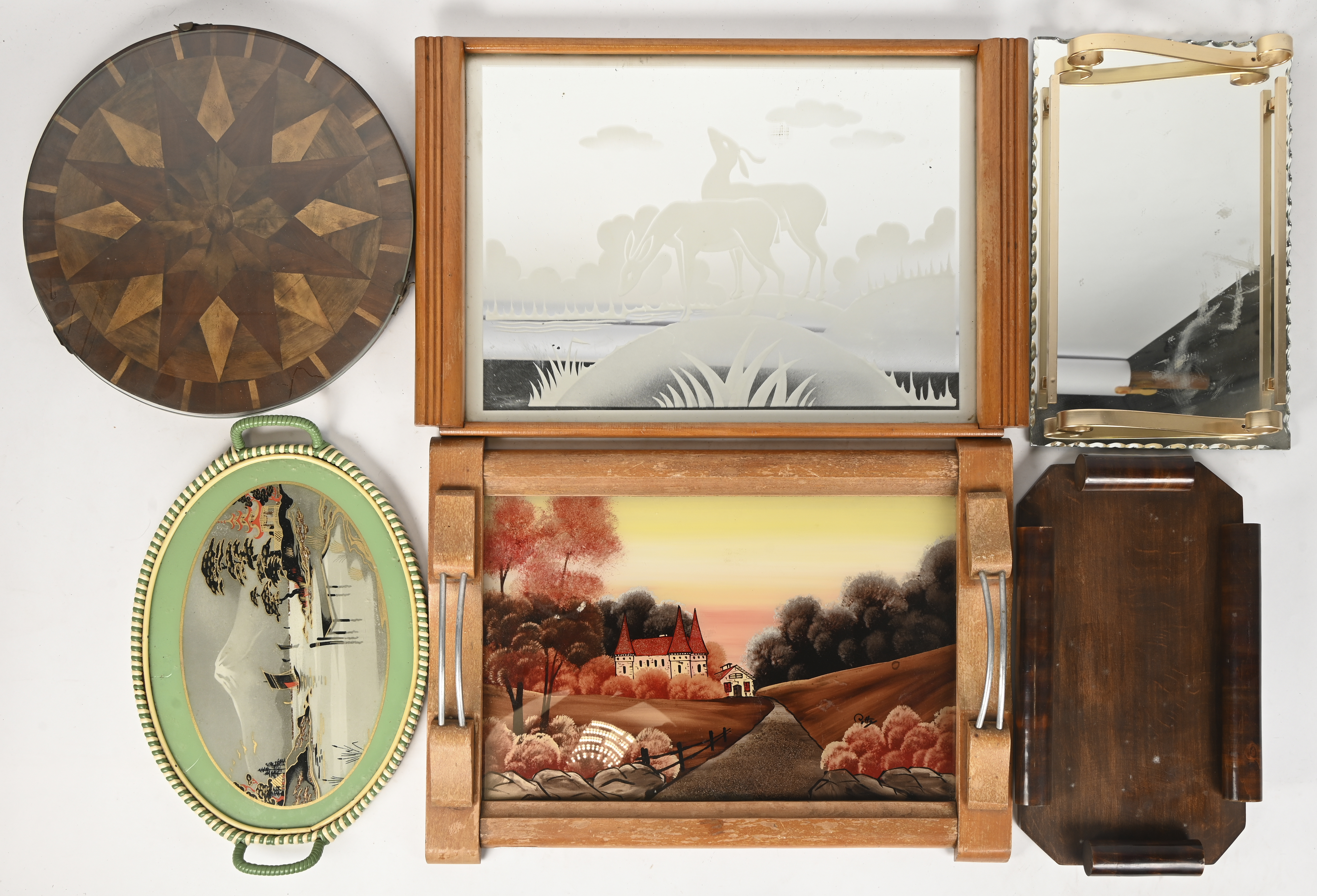 Een set meerkleurig Delfts aardewerk met floraal decor bestaande uit 3 dekselvazen waarvan 2 met haarlijnscheur, een schaal en een asbak.