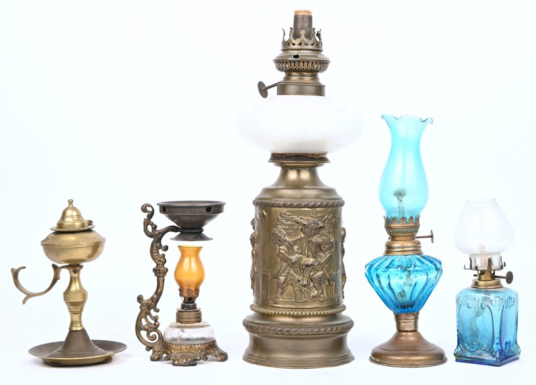 A lot of 5 oil lamps in various materials.