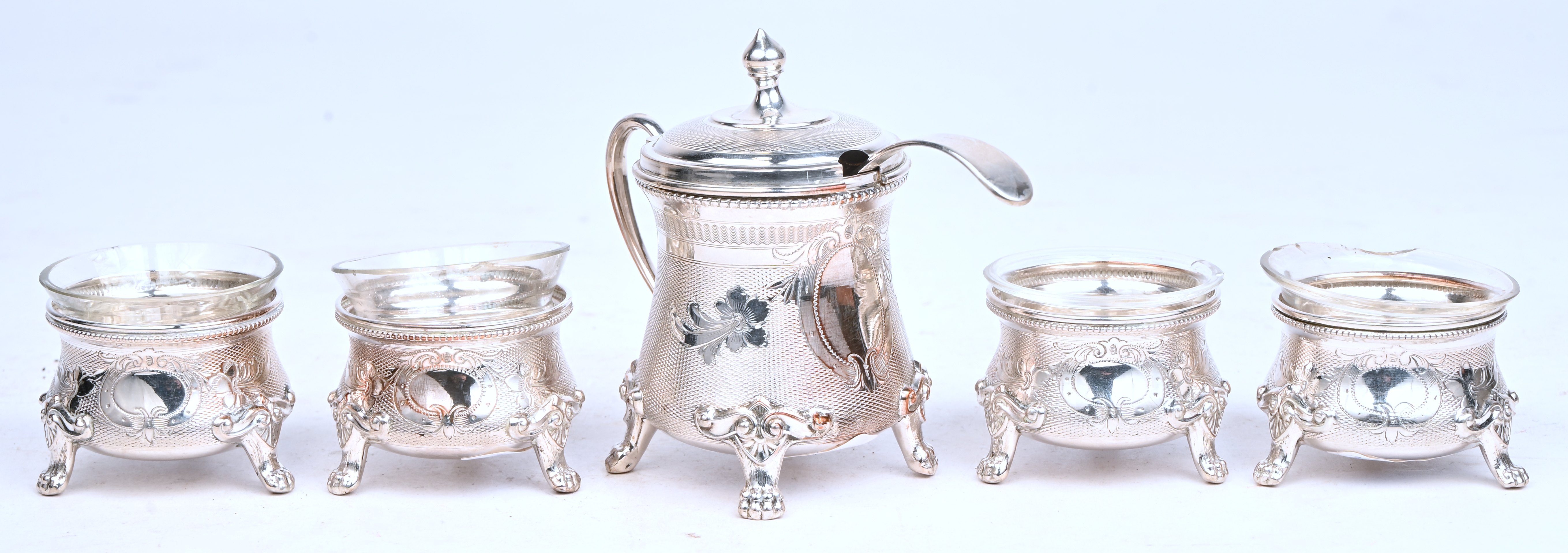 Een lot van 5 peper- en zoutpotjes met (meestal beschadigde) glazen inzetpotjes, het grootste met lepeltje. Duitse keuren, 800/1000. 160 gram. AR14/2 AR14/3 AR14/4