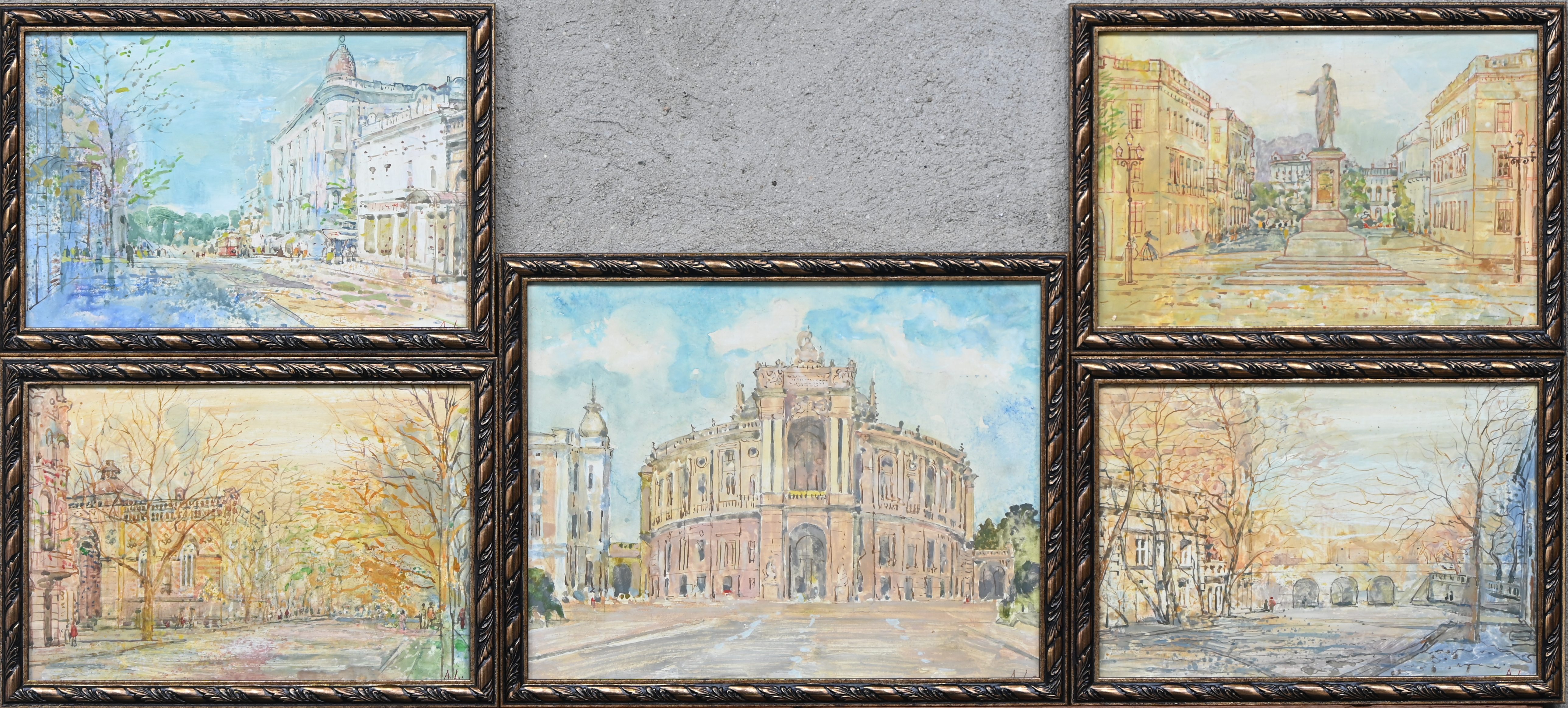 A lot of 5 small paintings, mixed media, featuring cityscapes of Odessa.