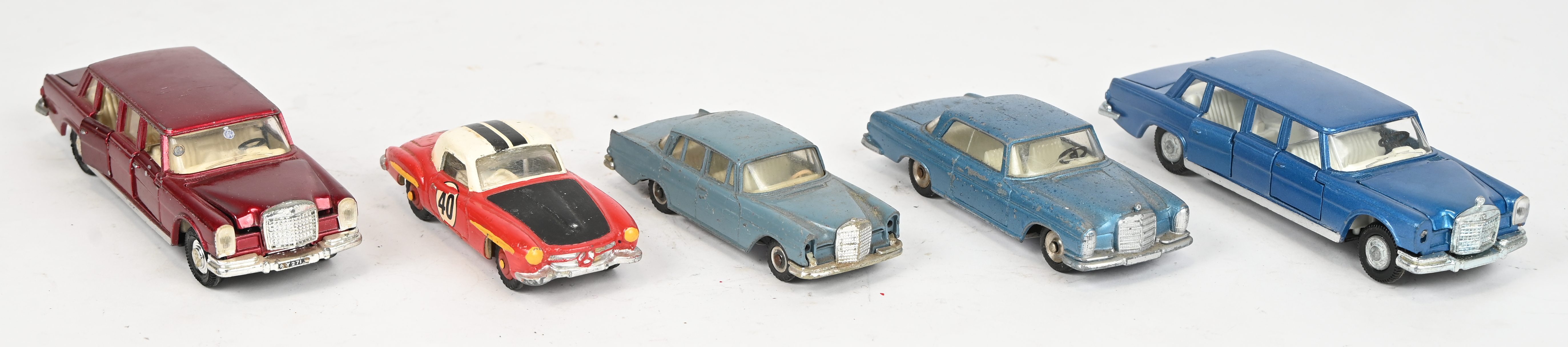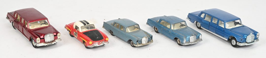 Een lot van 5 vintage die-cast Mercedes auto’s: 2 x Mercedes-Benz 600 limousine, 300 SE, 220 SE en een 190 SL.